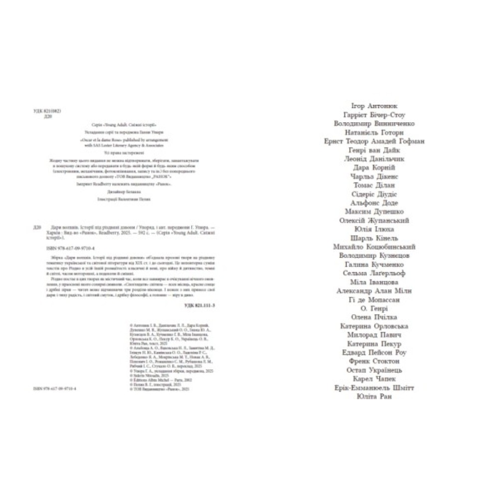 Тут своєю творчістю діляться О. Генрі Гі де Мопассан, Чарльз Дікенс і Сельма Лаґерлеф, Михайло Коцюбинський і Олена Пчілка, Дара Корній і Олексій Жупанський, Остап Українець і Катерина Пекур та ще ціла низка самобутніх авторів і авторок.