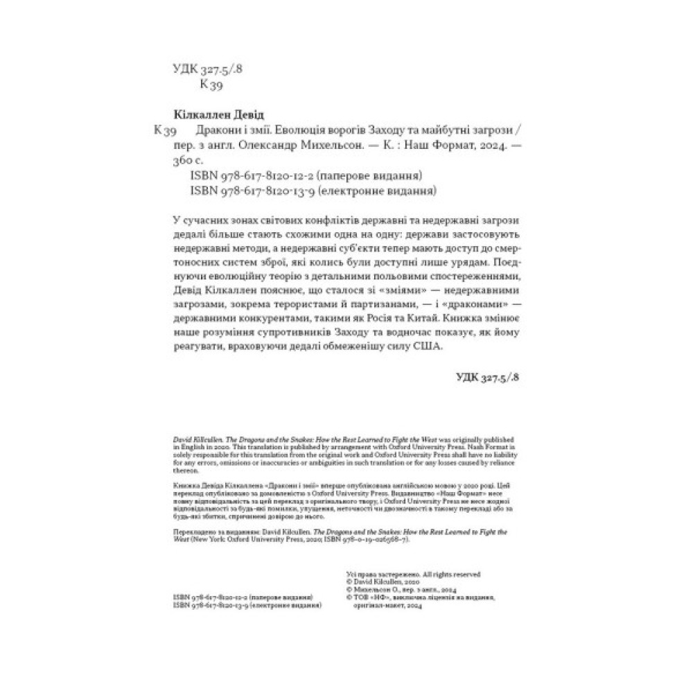У «Драконах і зміях» військовий, вчений та експерт із зовнішньої політики Девід Кілкаллен з’ясовує, чого навчилися противники Заходу за останні 30 років. Поєднуючи еволюційну теорію та детальні польові дослідження, він пояснює, що сталося зі «зміями» — недержавними загрозами, зокрема терористами і партизанами. Водночас показує адаптацію «драконів» — таких держав-конкурентів, як Росія, Китай, Іран, Північна Корея.