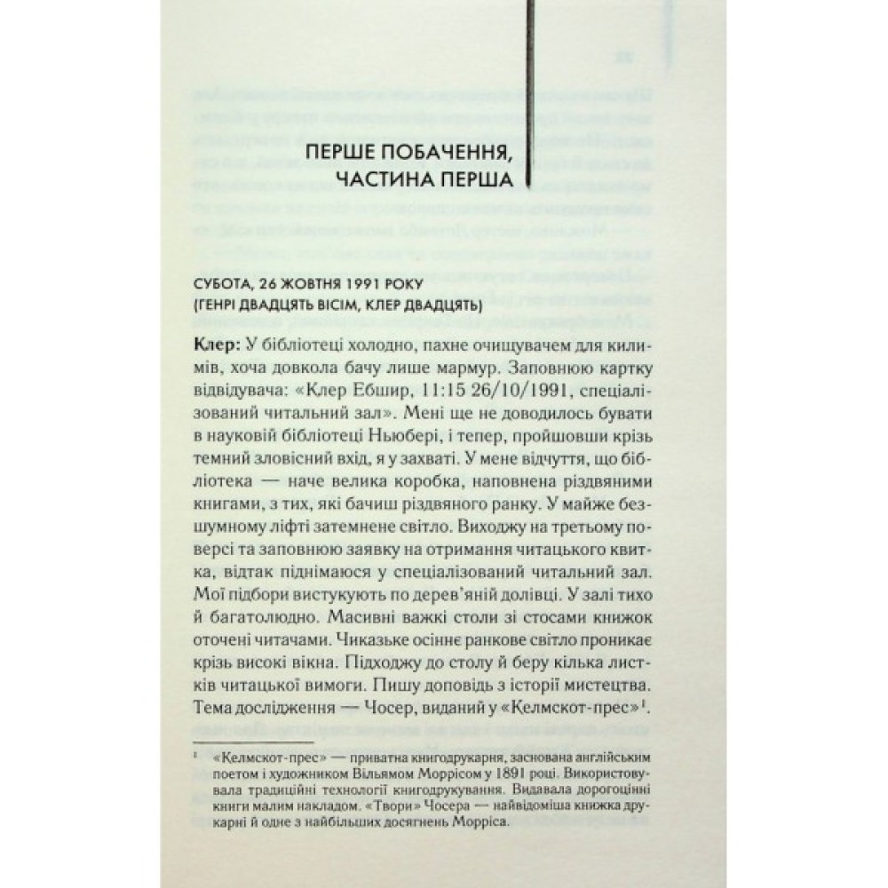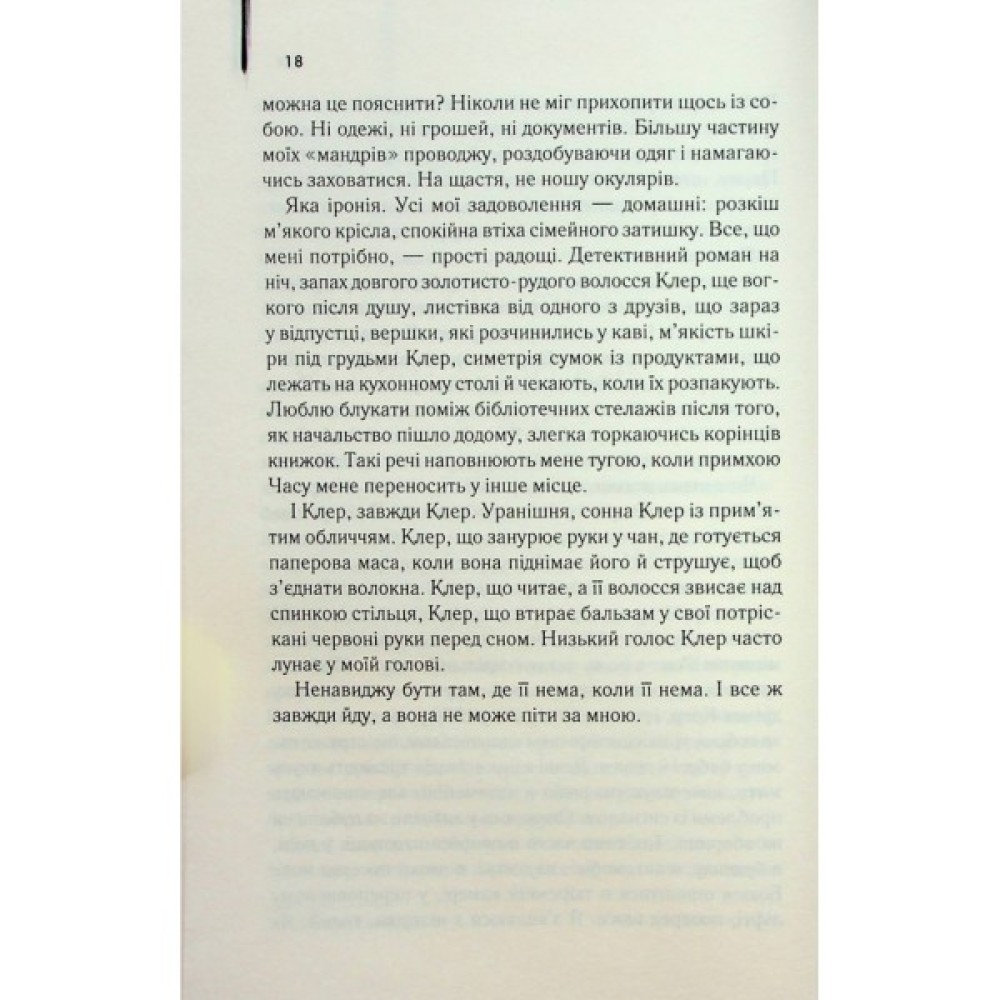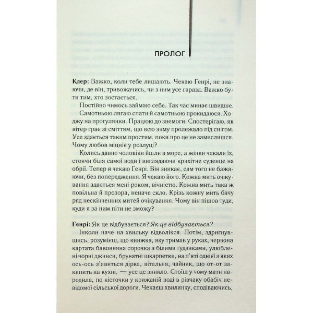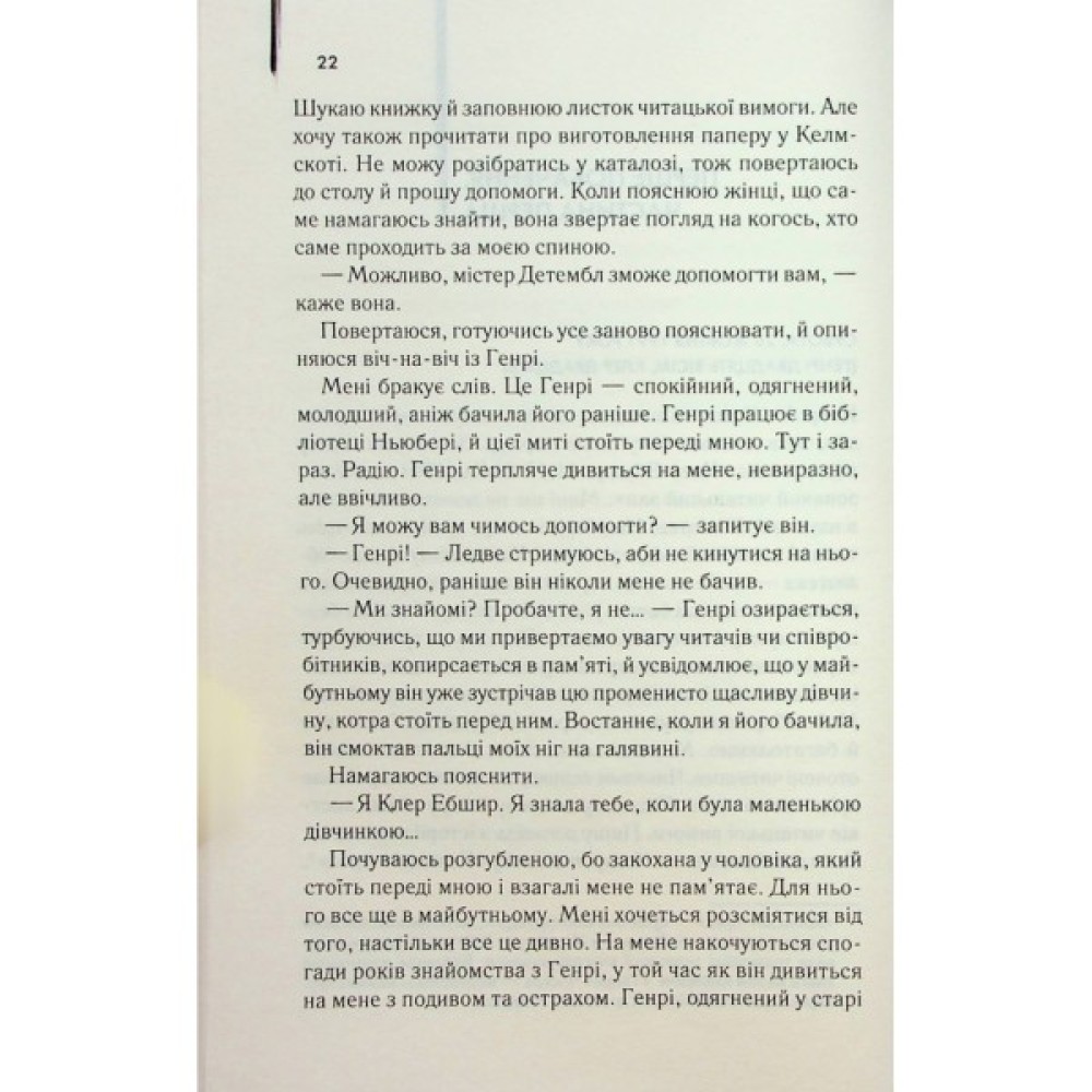 Де бере початок їх кохання — юної студентки художнього коледжу і 28-річного бібліотекаря? Бо ще з дитинства Клер знала, що їй судився саме цей чоловік, відколи вперше побачила його — сорокатрирічним. Бо з дитинства знала його таємницю: Генрі — мандрівник у часі… Усе їх кохання буде зустрічами і розлуками, щастям і болем. Раз за разом Генрі зникатиме з її життя, закинутий у минуле… Пронизлива історія про кохання, що заблукало у часі, і життя з відчуттям нескінченності, що перемагає смерть.