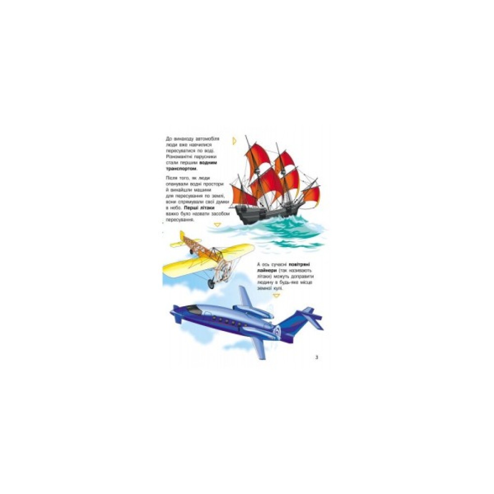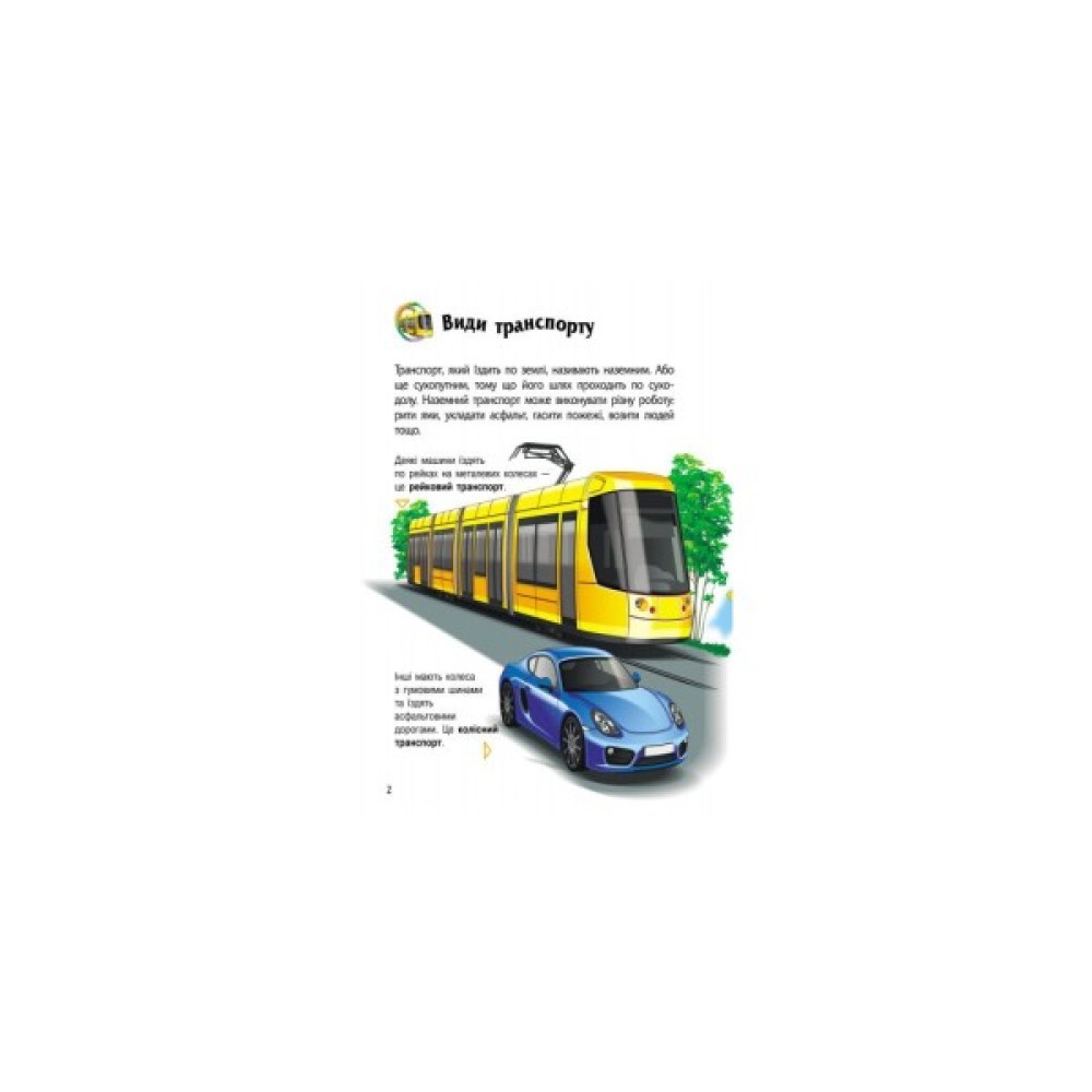 Гадаєте, вашому синочкові чи донечці ще зарано знайомитися з енциклопедіями? Ця книжка стане в пригоді навіть дворічному малюкові! Розглядайте разом ілюстрації, читайте текст і дізнавайтеся багато цікавого про вантажний, будівельний, повітряний, водний, військовий і багато інших видів транспорту, а ще про безпеку поблизу доріг і залізничних колій.