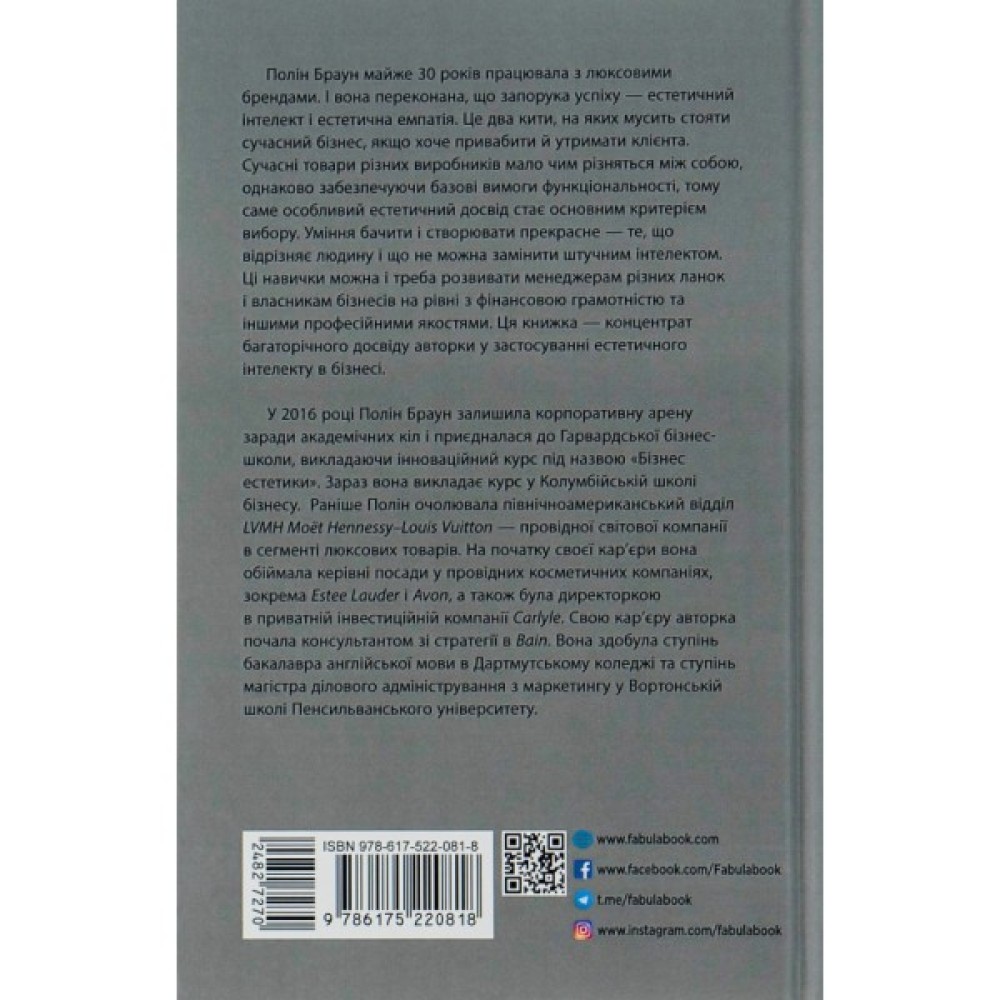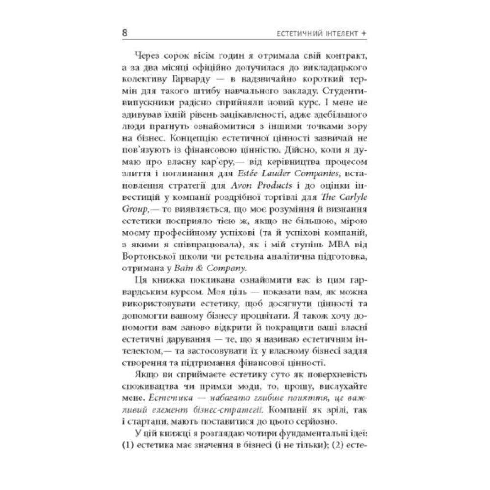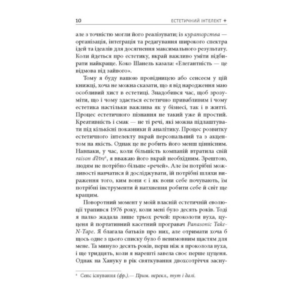 Книжка Полін Браун «Естетичний інтелект» показує, наскільки важлива естетика в нашому житті і, звісно, в бізнесі. Пані Браун переконана: це м’яз, який можна накачати, тобто будь-хто може розвинути естетичне чуття й застосовувати це вміння на практиці. На думку авторки, естетична складова продукту не менш важлива за його функціональність, а компанії мусять приділяти естетиці стільки ж уваги, скільки й фінансовим звітам. Як прокачати «естетичний м’яз», як сформувати естетичну цінність товарів, як правильно розказати про це споживачам — на ці й інші теми авторка веде з читачем невимушену розмову, наводячи безліч прикладів сильних естетичних рішень, втім, залишає досить простору для власних висновків.