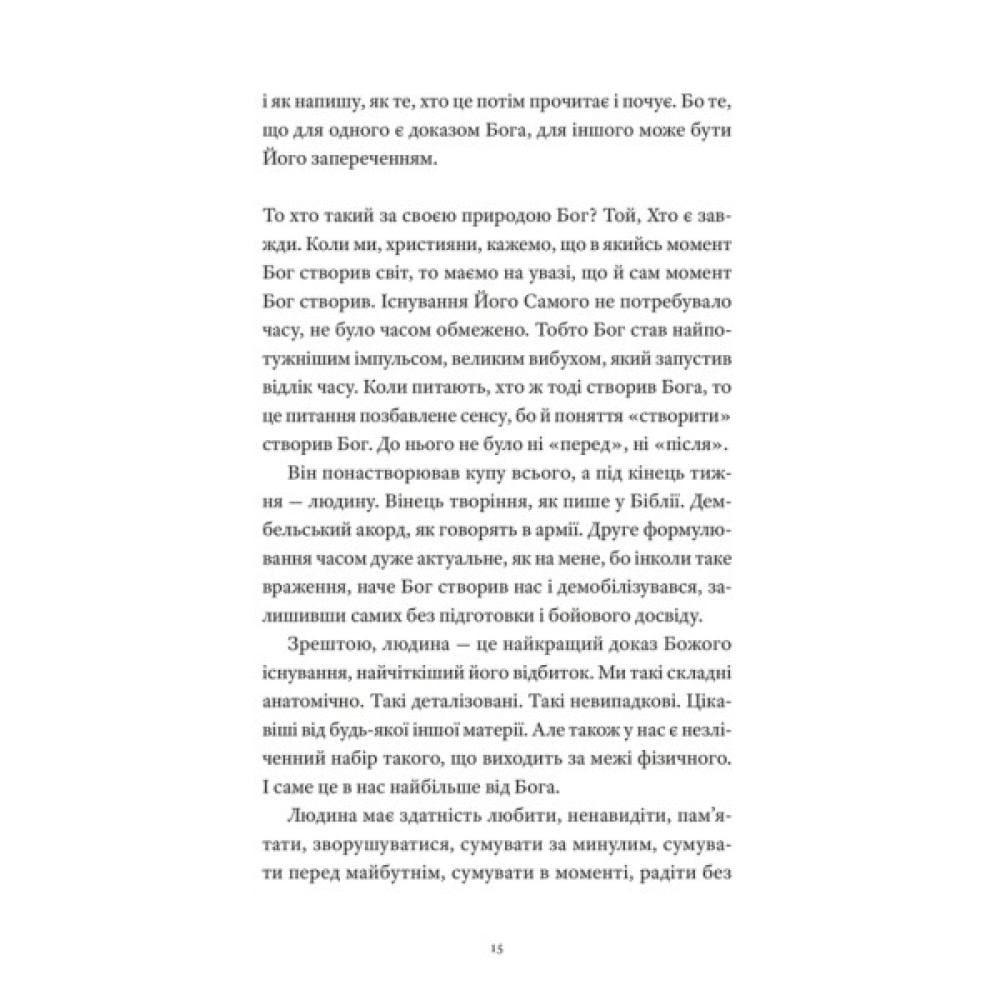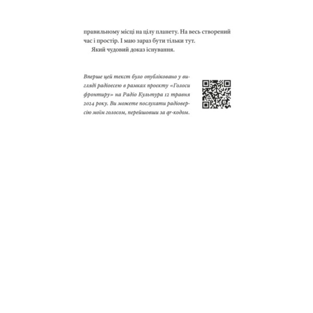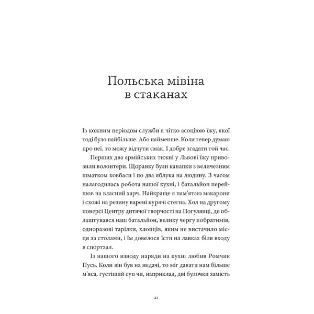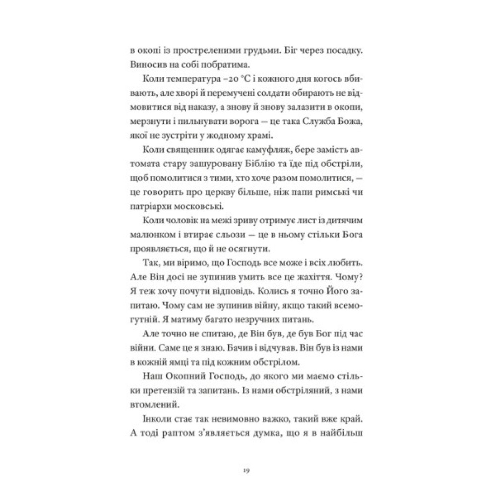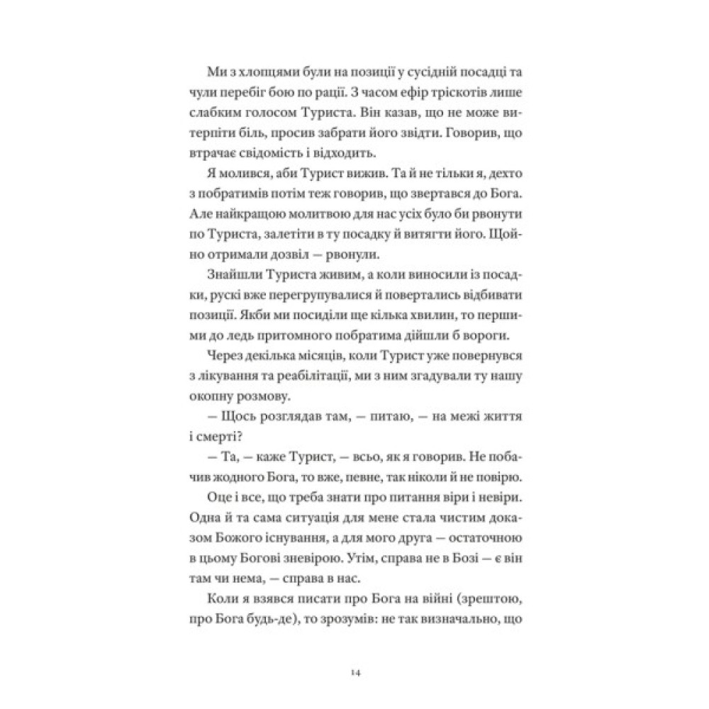 Ця книга короткої прози — свідчення солдата про досвід великої війни. Віра на фронті, братерство між військовими, страх і надія, смерть і Любов. Автор пропрацьовує власні травматичні спогади, але текст може стати психо­терапією не лише для нього, а й для читачів.