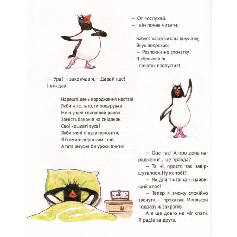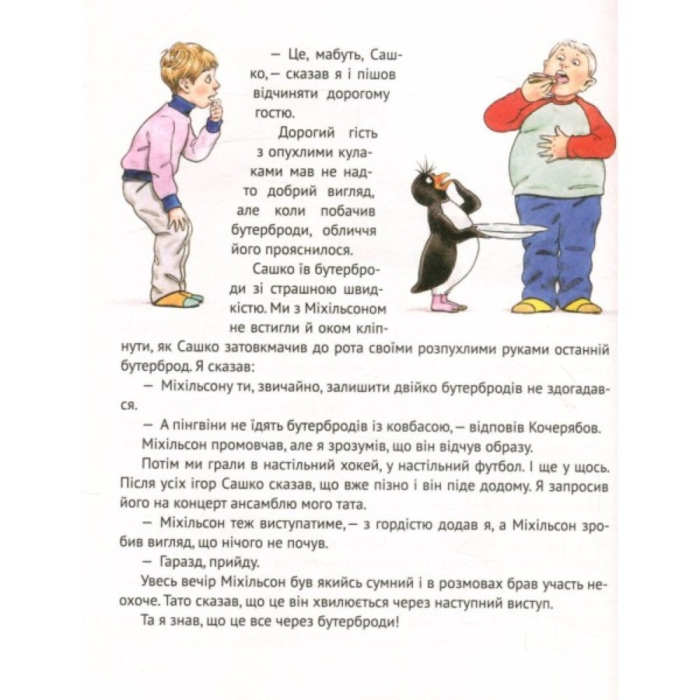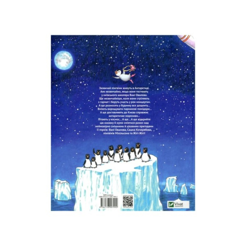 Зазвичай пінгвіни живуть в Антарктиді. Але незвичайно, якщо вони гостюють у київського школяра Вані Овалова. Ще незвичайніше, коли вони стріляють з гармат і беруть участь у рок-концертах. А ще розносять у будинку все дощенту... Вміють вирощувати парникові помідори... А ще доставляють до Києва справжнє антарктичне морозиво... Літають у космос... А ще... А ще відкрийте цю книжку й нумо сміятися разом над неймовірно смішними й цікавими пригодами її героїв: Вані Овалова, Сашка Кочерябова, пінгвінів Міхільсона та Жігі-Жігі!