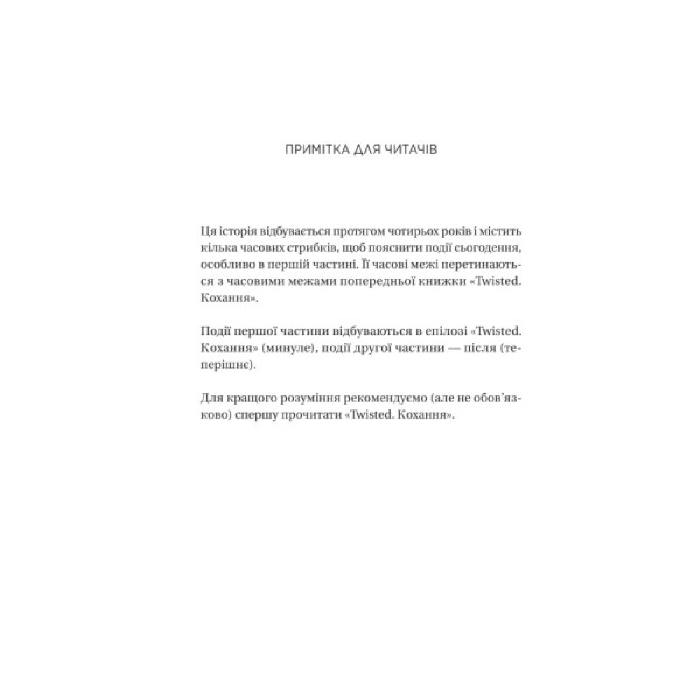 Другий роман серії Twisted обіцяє не менше зворушливих, емоційних і пристрасних епізодів, ніж у першій частині — «Кохання». У центр сюжету цієї історії Ана Хван поміщає інших персонажів, тож її можна читати без попереднього ознайомлення з дебютною книгою циклу.