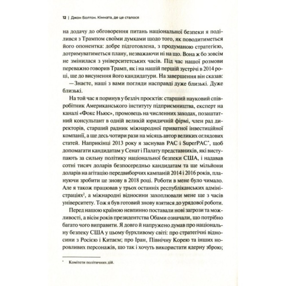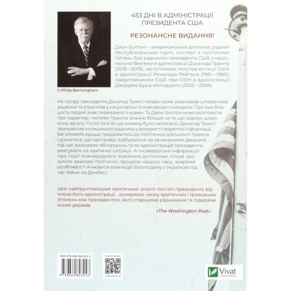 Цю книжку намагалися заборонити через суд, та, попри все, вона була опублікована. На посаді президента Дональд Трамп чотири роки ухвалював суперечливі рішення та втрапляв у національні й міжнародні скандали. Про них більшість знає переважно з новин. Та Джон Болтон може розповісти про характер і мотиви Трампа значно більше за те, що відомо широкому загалу.