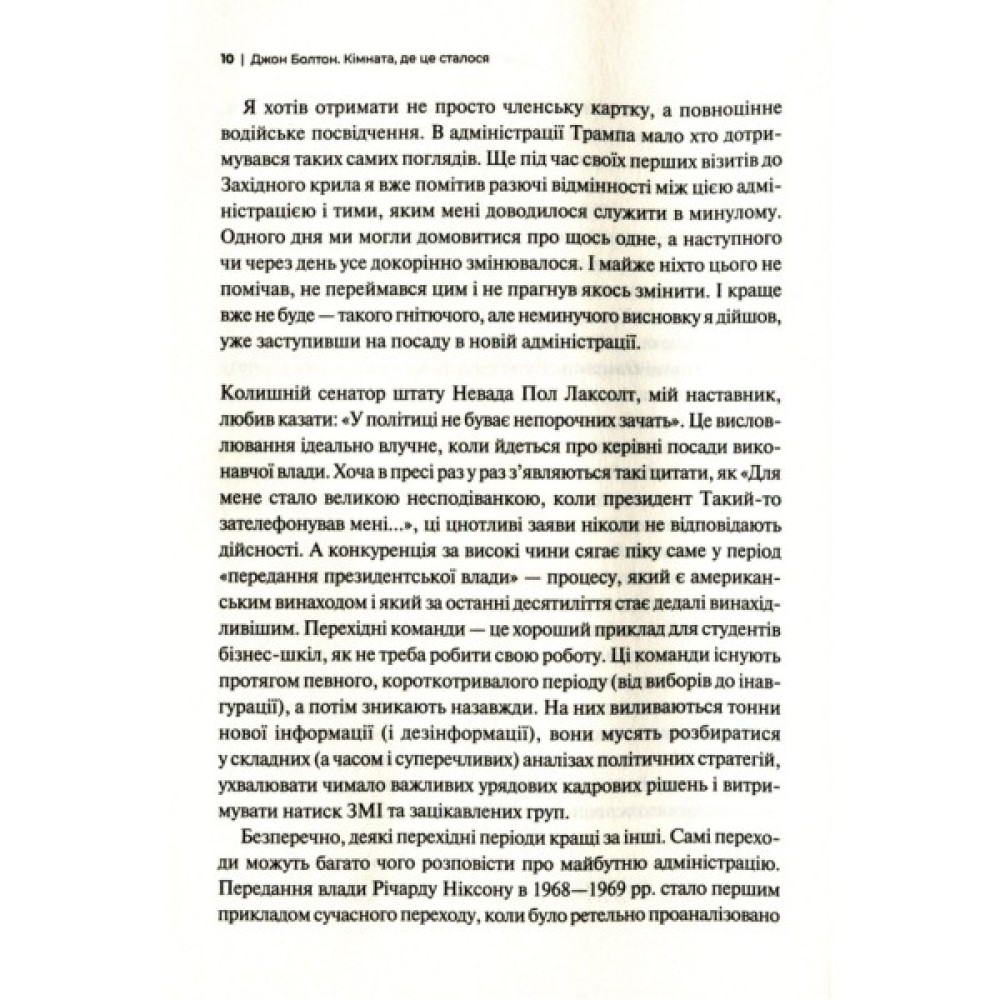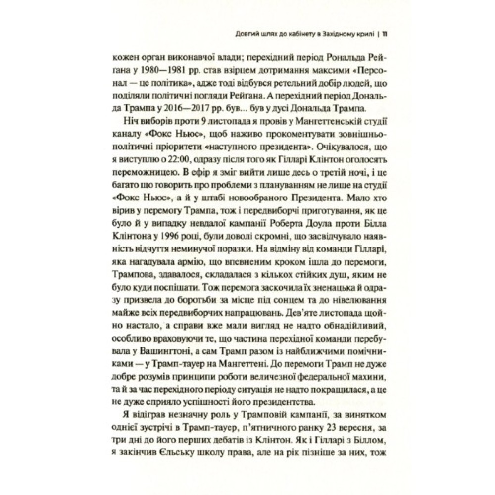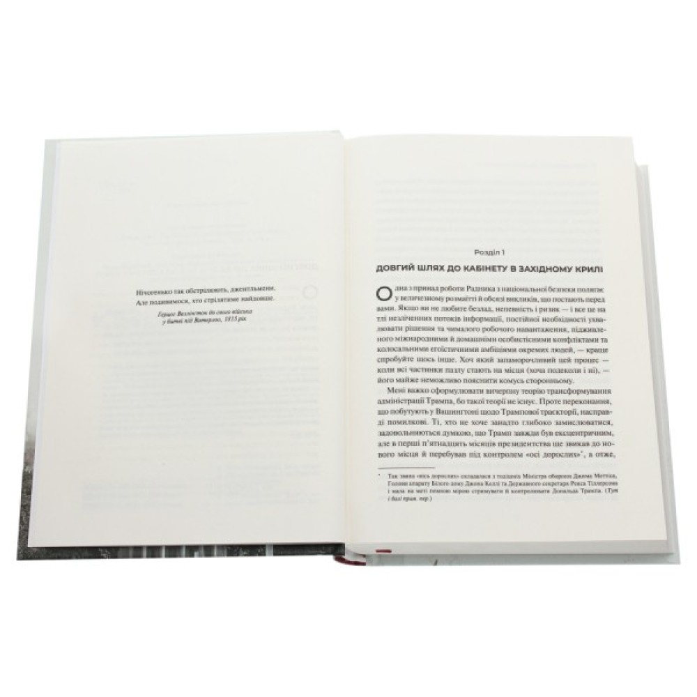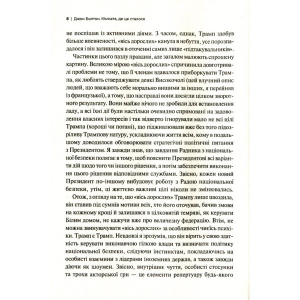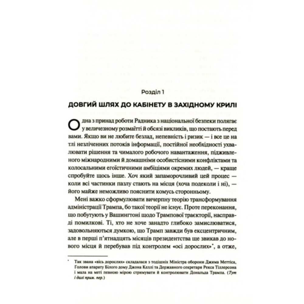 Після написання цієї книжки Дональд Трамп звинуватив колишнього радника у розкритті секретної інформації. Ви зможете краще придивитись до політичної діяльності Трампа і дізнатися, що насправді відбувалося за зачиненими дверима під час важливих обговорень та як адміністрація президента реагувала на критичні ситуації. А інсайдерська інформація про події міжнародного значення допоможе ліпше зрозуміти важливі політичні процеси нашого часу, зокрема особливості й нюанси взаємодії Білого дому з Україною під час війни на Донбасі.
