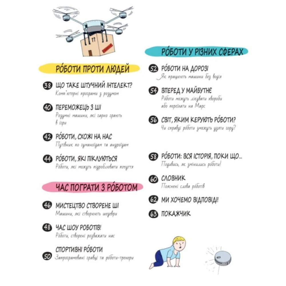 ЦЯ КНИГА НАПОВНЕНА НАЙЦІКАВІШИМИ ФАКТАМИ ПРО РОБОТІВ ТА ШТУЧНИЙ ІНТЕЛЕКТ. Прочитавши її ви станете справжнім розумником, який знає: які брудні та страшні завдання можуть виконувати тільки роботи, як наноботи можуть боротись із шкідниками всередині людського організму та чому самокеровані автомобілі рятують життя. Випробуйте свої технічні знання та спробуйте: побудувати робото-руку, яка може захоплювати предмети, зробити механічну стрибаючу жабку, спробуйте побити рекорд робота в баскетболі Не важливо, чи ти вчений-початківець, професіонал з програмування чи просто любиш роботів – ця книжка має багато цікавого для кожного розумника.