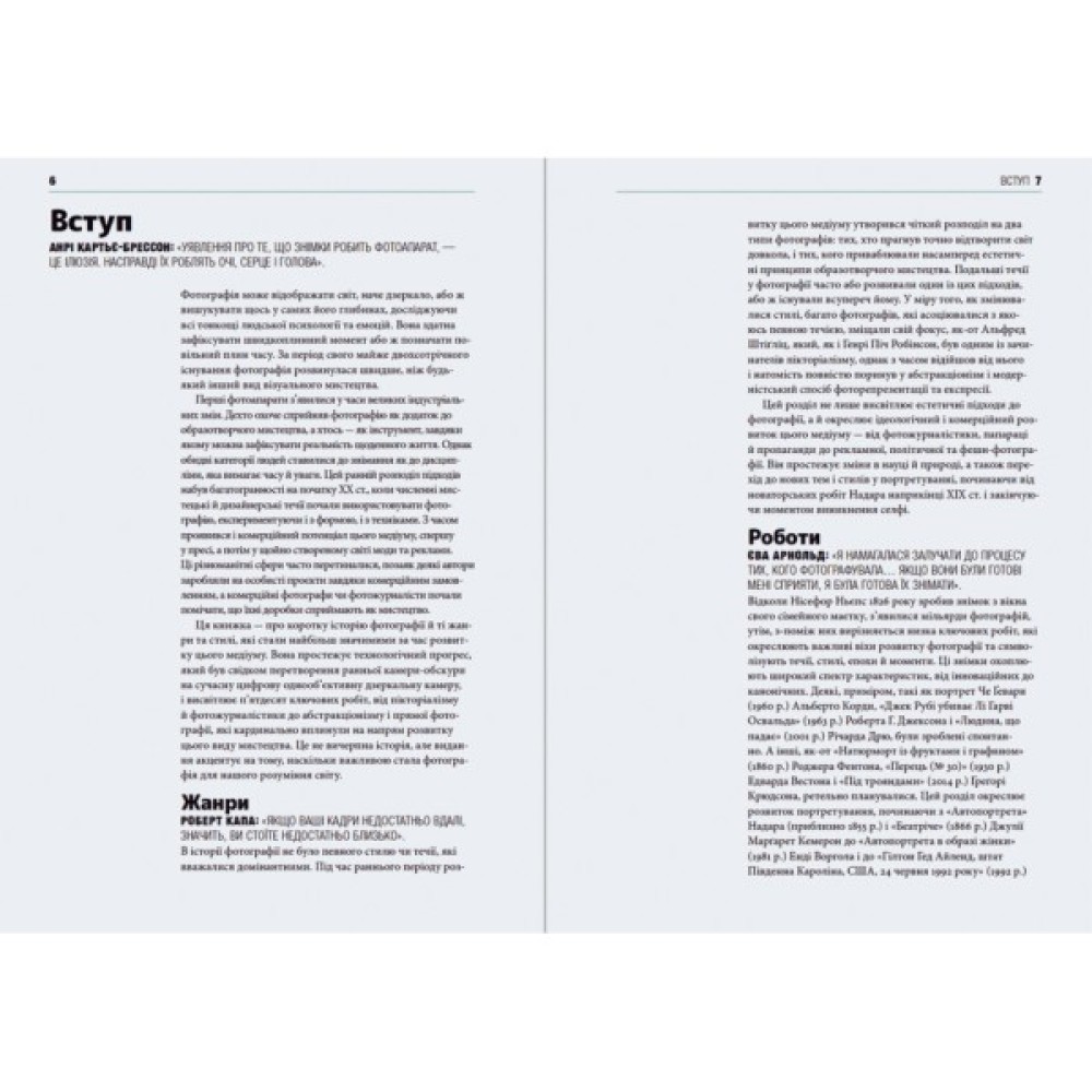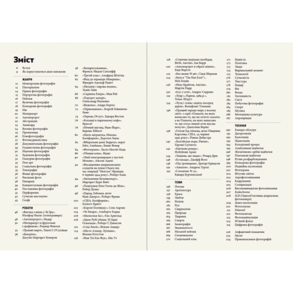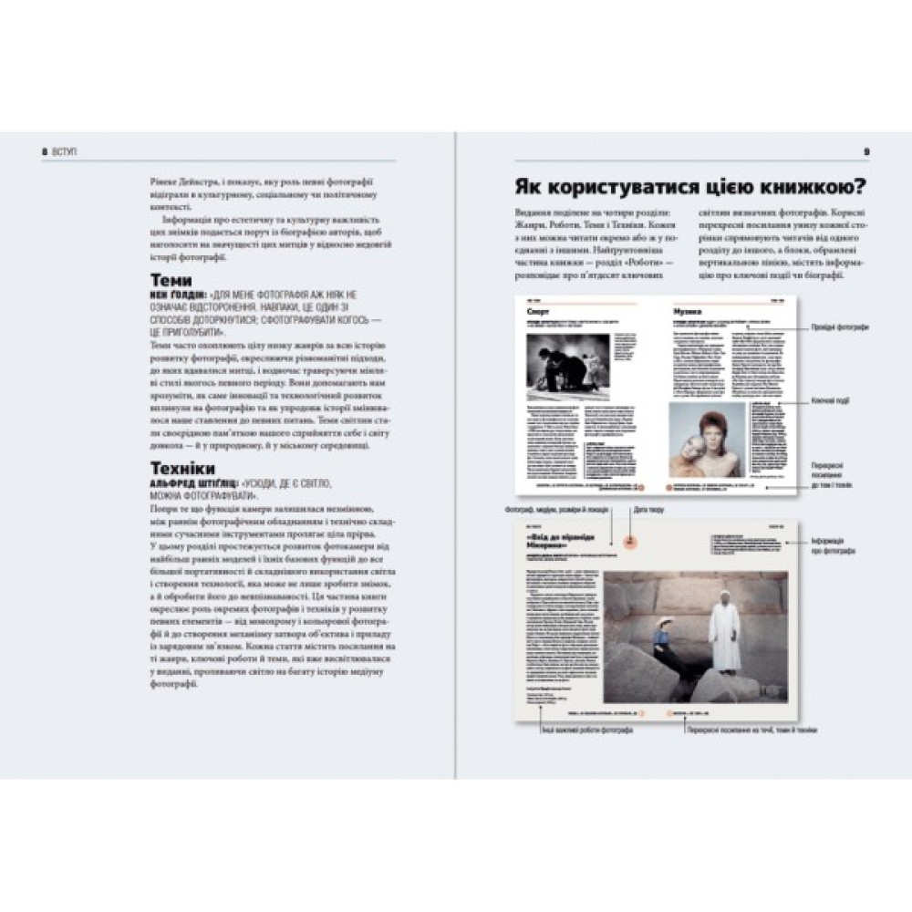 З книжки ви довідаєтеся, як, чому та коли певні фотографії справді змінили світ. Дизайн видання і продумана структура допомагають читачам легко орієнтуватися у ключових жанрах, митцях, темах та техніках фотографії.