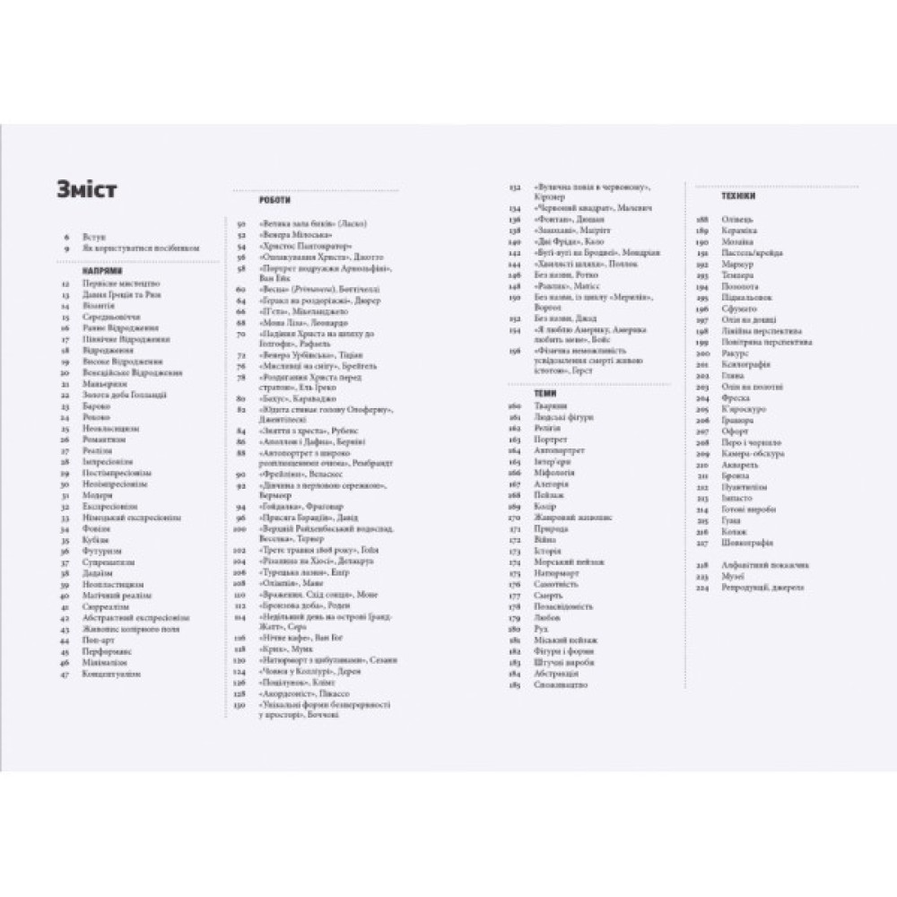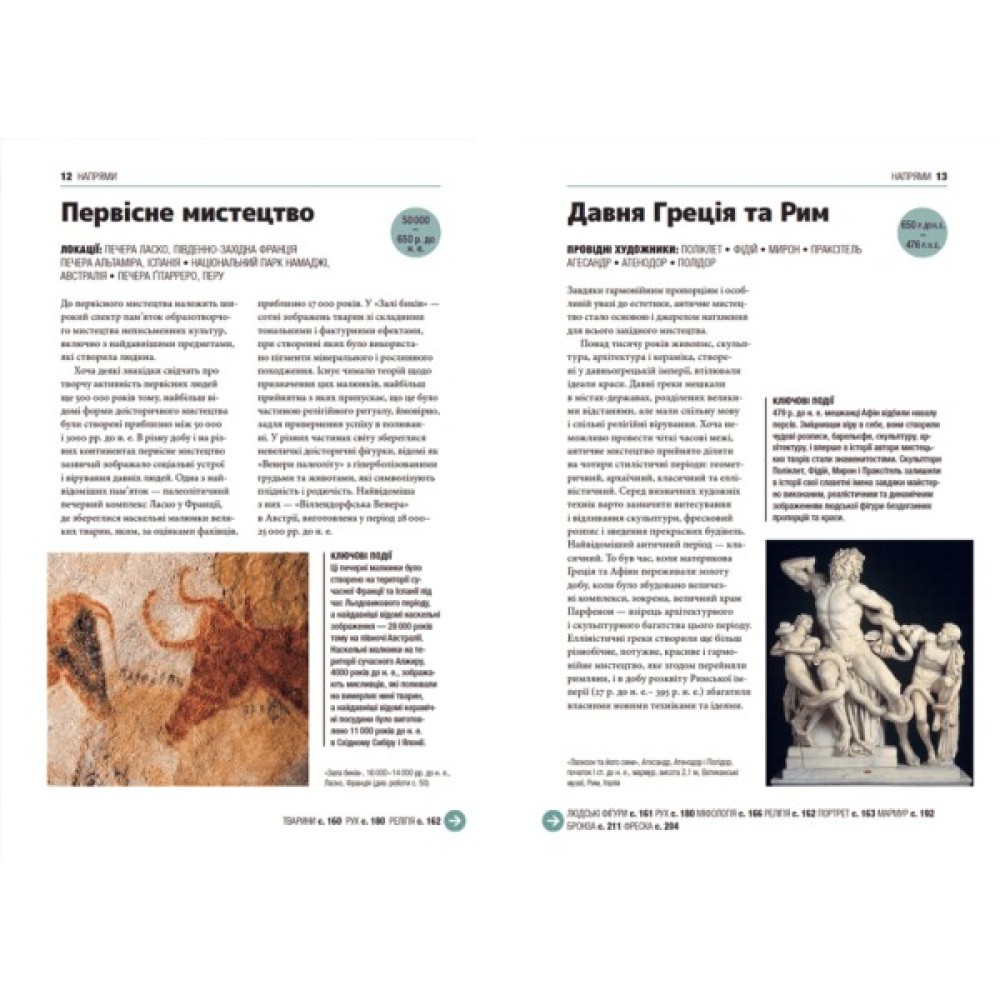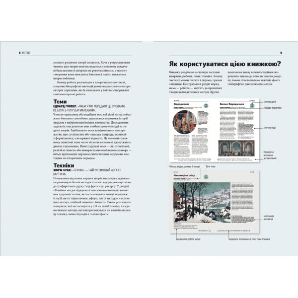 Завдяки цьому кишеньковому пораднику ви зможете відстежити розвиток мистецтва від найдавніших часів, дізнатися про найвидатніших представників культурних епох і мистецьких рухів та переглянути їхні найвідоміші роботи. Кожну із них розглянуто в історичному контексті, а короткі біографічні анотації дають ширше уявлення про авторів і першоджерела їхньої творчості.