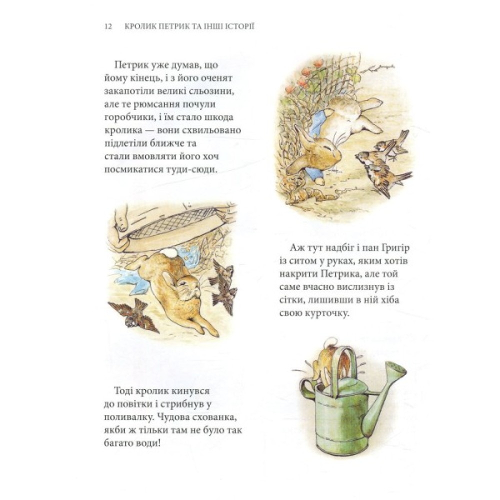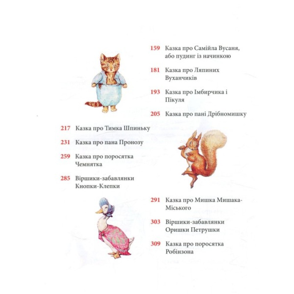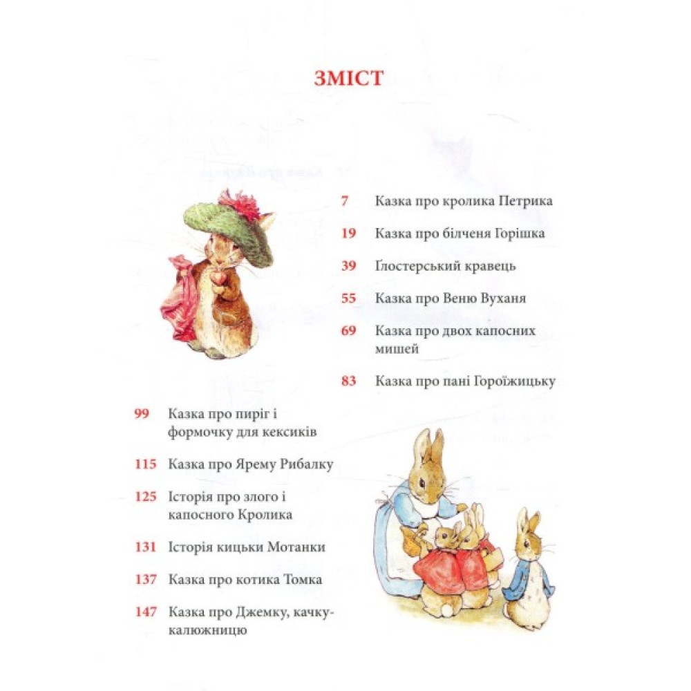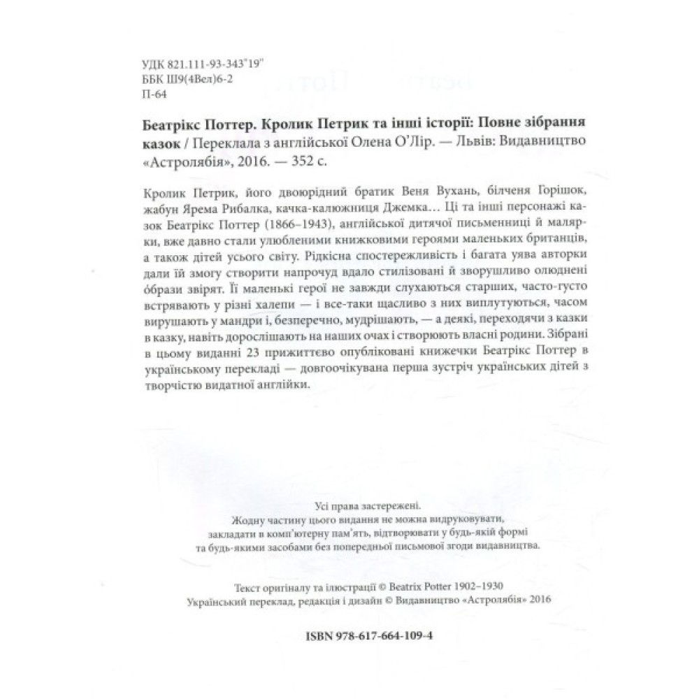 Кролик Петрик, його двоюрідний братик Веня Вухань, білченя Горішок, жабун Ярема Рибалка, качка-калюжниця Джемка… Ці та інші персонажі казок Беатрікс Поттер (1866–1943), англійської дитячої письменниці й малярки, вже давно стали улюбленими книжковими героями маленьких британців, а також дітей усього світу. Рідкісна спостережливість і багата уява авторки дали їй змогу створити напрочуд вдало стилізовані й зворушливо олюднені óбрази звірят. Її маленькі герої не завжди слухаються старших, часто-густо встрявають у різні халепи — і все-таки щасливо з них виплутуються, часом вирушають у мандри і, безперечно, мудрішають, — а деякі, переходячи з казки в казку, навіть дорослішають на наших очах і створюють власні родини. Зібрані в цьому виданні 23 прижиттєво опубліковані книжечки Беатрікс Поттер в українському перекладі — довгоочікувана перша зустріч українських дітей з творчістю видатної англійки.
