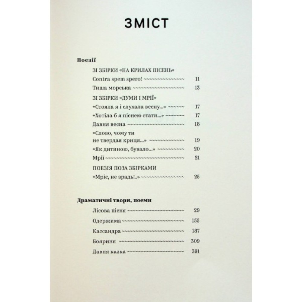 Хто для нас Леся Українка?.. Це Мавка, українська Кассандра; це й її знамените «Щоб не плакать, я сміялась», і водночас «Ні! Я жива! Я вічно буду жити!»… Це наш національний код незламності. Серед доробку Лесі Українки не лише поезії, а й переклади, проза, драматичні поеми — жанр, який особливо розвивала письменниця в українській літературі. У цій збірці ми пропонуємо насолодитися найвідомішими віршами авторки, серед яких «Давня весна», «Хотіла б я піснею стати...», «Як дитиною, бувало...» тощо. Також до вашої уваги драма-феєрія «Лісова пісня», поеми «Одержима», «Кассандра», «Бояриня», «Давня казка».