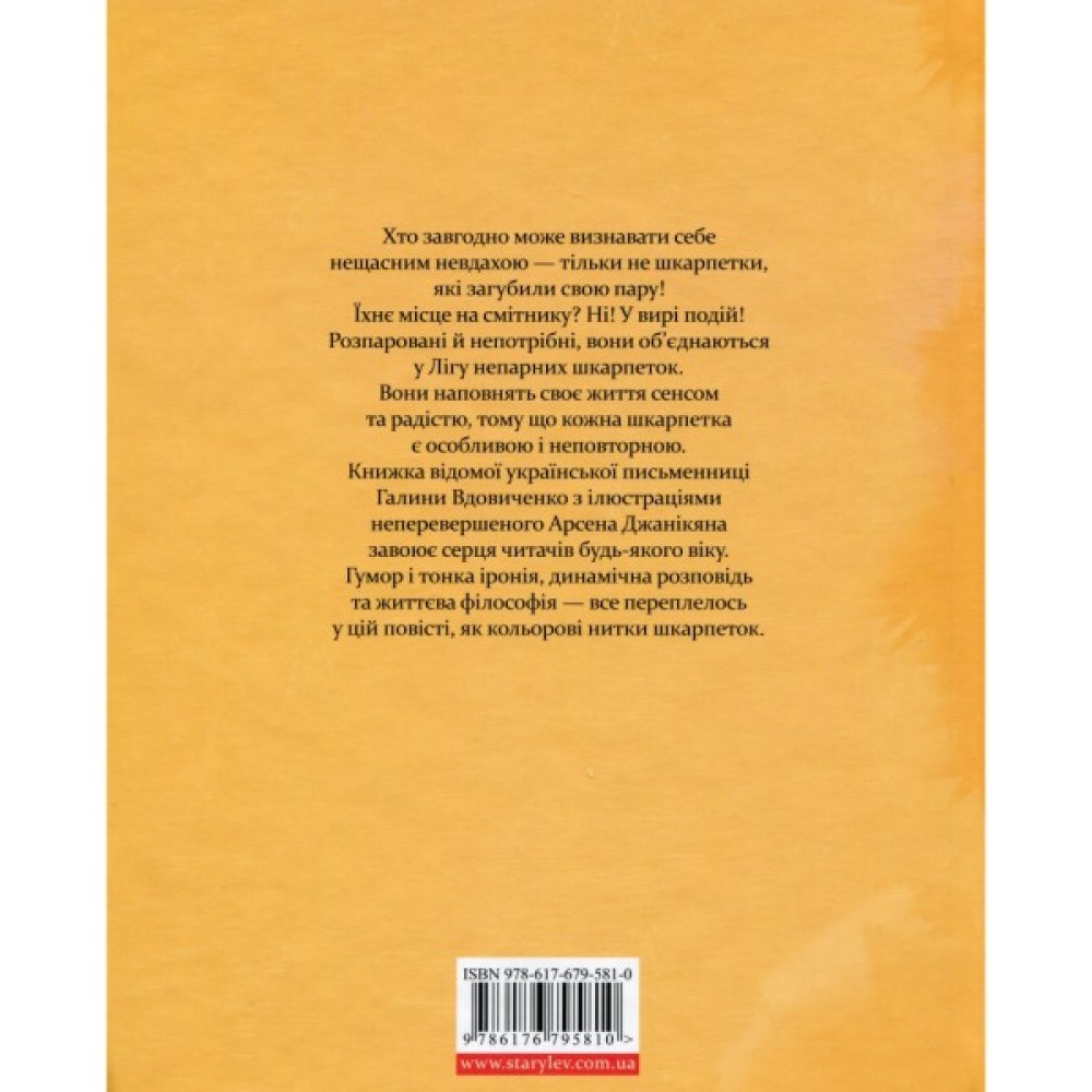 Книжка відомої української письменниці Галини Вдовиченко з ілюстраціями неперевершеного Арсена Джанікяна завоює серця читачів будь-якого віку. Гумор і тонка іронія, динамічна розповідь та життєва філософія — все переплелось у цій повісті, як кольорові нитки шкарпеток.