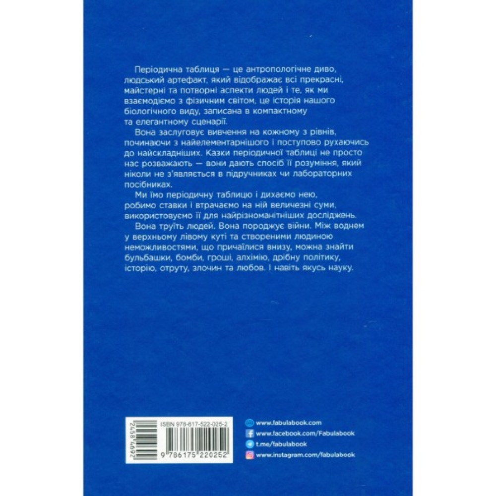 Через що Магатма Ґанді ненавидів йод? Як радій майже зіпсував репутацію Марії Кюрі? Чому галій є улюбленим елементом хіміків-жартівників? Ці та інші неймовірні оповіді про науку, історію, фінанси, міфологію, мистецтво, медицину тощо розкаже періодична система хімічних елементів. Вона є не лише видатним науковим досягненням, а й скарбницею пригод, зради та одержимості. Книжка містить захопливі факти про багато хімічних елементів, а також їхню роль в історії людства та житті своїх першовідкривачів. Ви дізнаєтеся, що відбувається всередині зорь і до чого тут Великий вибух. І це буде дуже цікаво для допитливих читачів будь-якого віку.