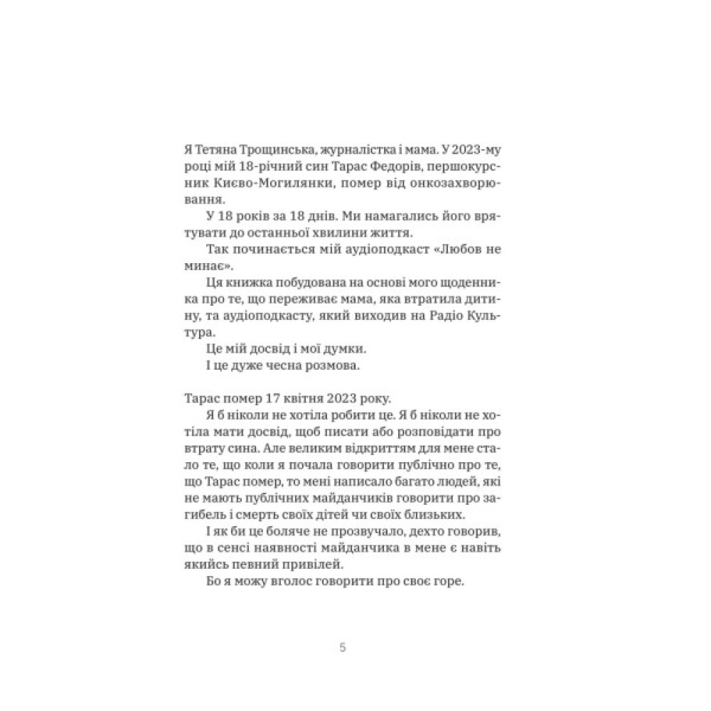«Любов не минає» — це щоденник мами, яка ділиться своїм досвідом проживання втрати — після раптової смерті 18-річного сина внаслідок онкологічного захворювання. Авторка поєднує особисті рефлексії, історії тих, хто живе після смерті чи загибелі близької людини, поради фахівців і фахівчинь.