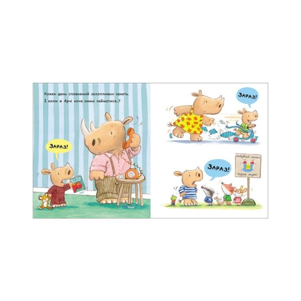 Ох, як же важко чекати... А надто, коли ти маленький. Татусь ніяк не надує басейн у садку. Черга на батут така довга. А до відпустки ще цілих десять днів! У носоріжці на ім’я Арчі батьки певно впізнають свого непосидючого малюка, який хоче отримати все тут і зараз. На сторінках книги оселилися веселі і такі життєві історії про маленького носорога та його батьків. Тож чому б не почитати книжку просто зараз?