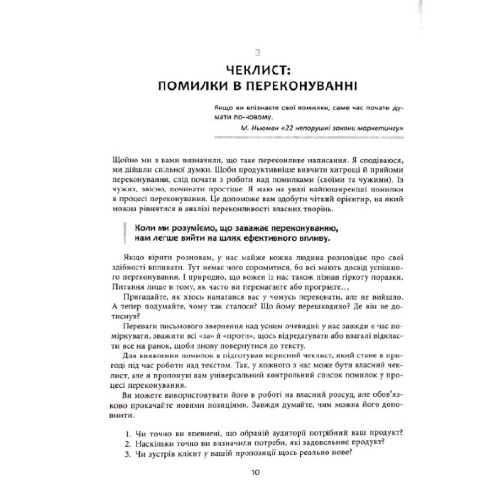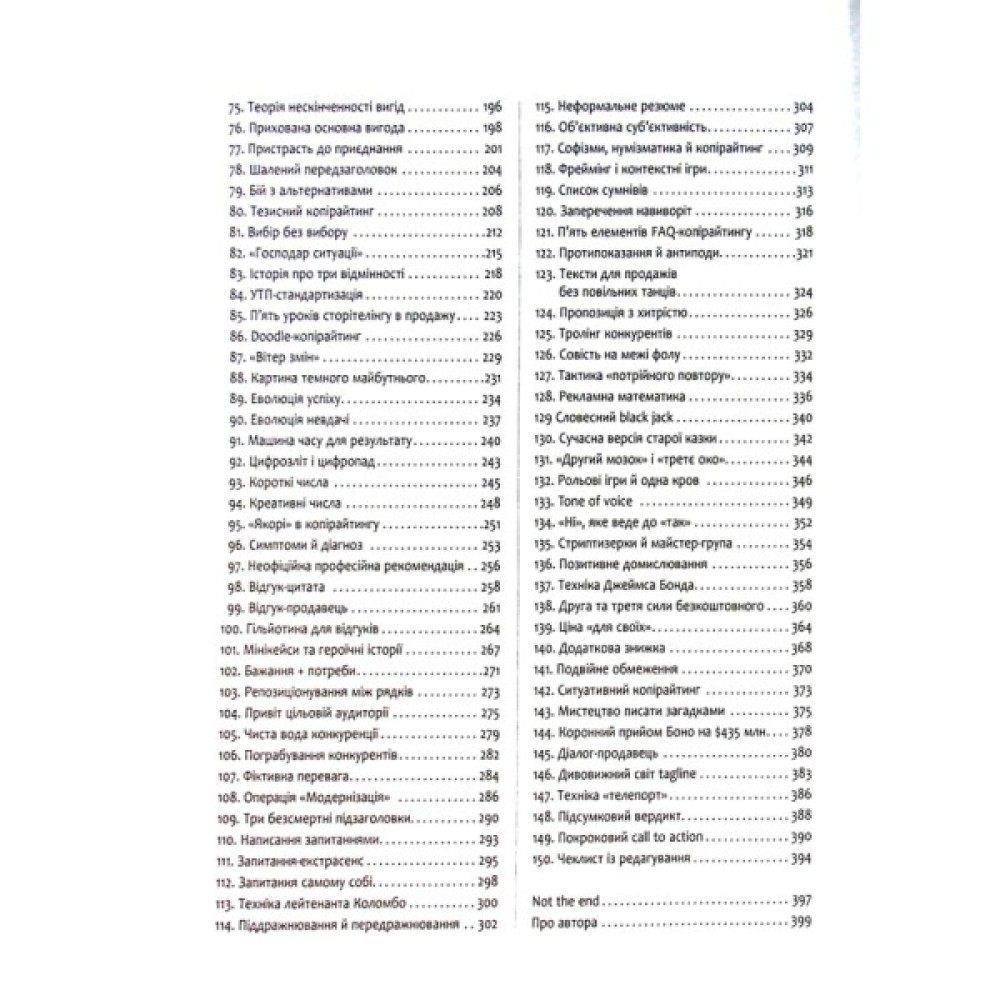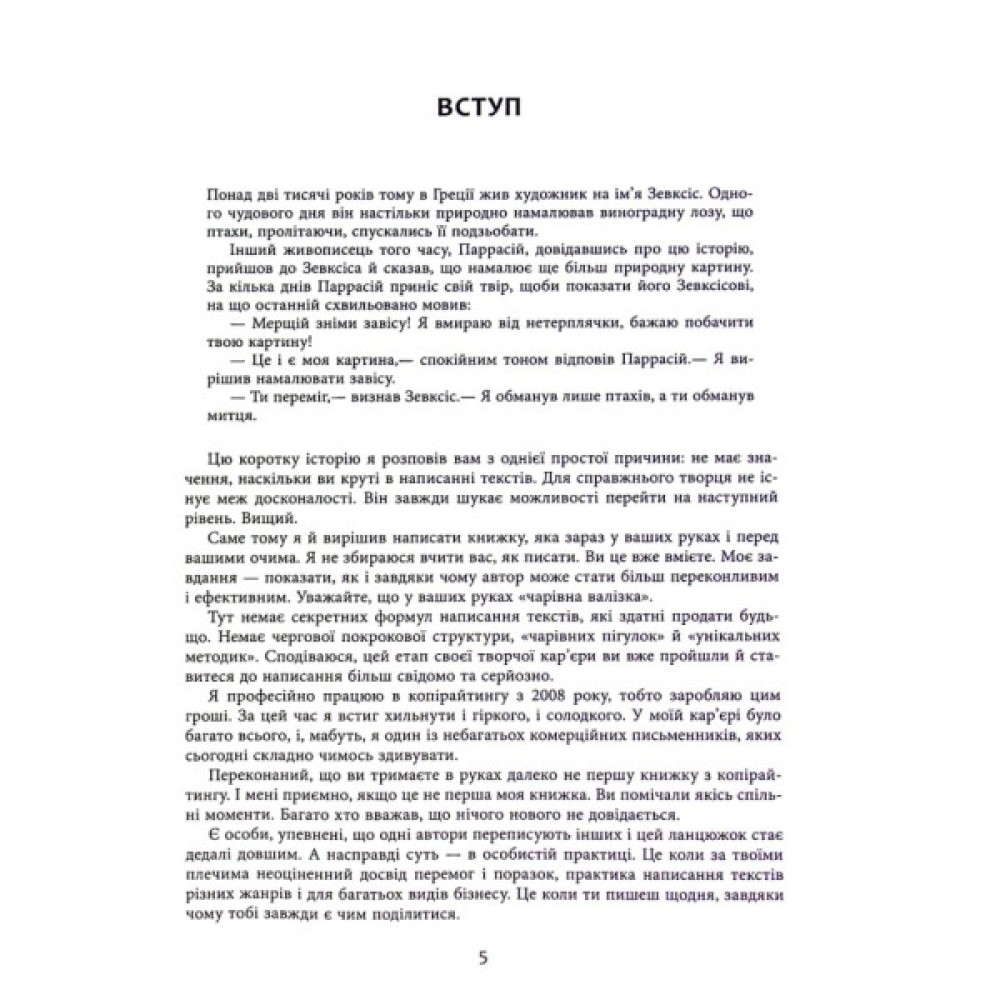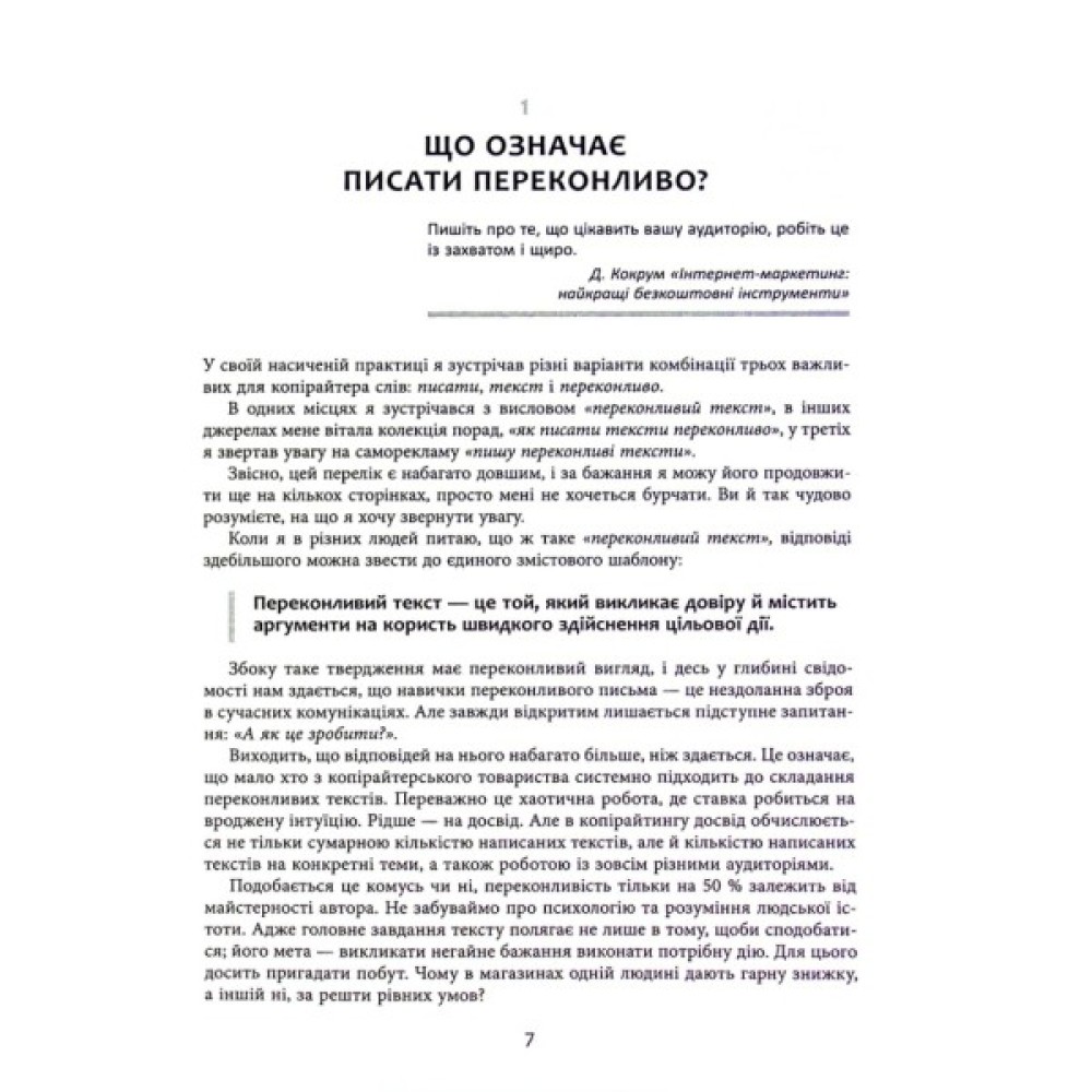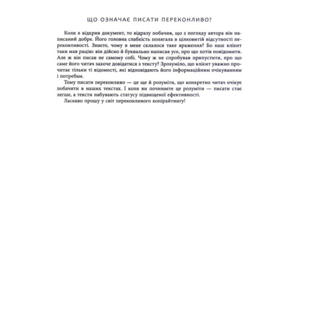 Книжка Дениса Каплунова є посібником для тих, хто опановує мистецтво писати рекламні тексти. Це, за словами автора, «чарівна валізка» копірайтера: зібрання чітких (але не догматичних) правил, повчальних (і дотепних) нотаток, показових (і яскравих) епізодів від успішного автора-практика. А ще книжка спрямована на розвиток вашого чуття в застосуванні прийомів копірайтингу з огляду на психологію клієнта. Таке чуття завдяки читанню цієї книжки ви обов’язково розвинете, або, як говорить сам автор,— «прокачаєте».