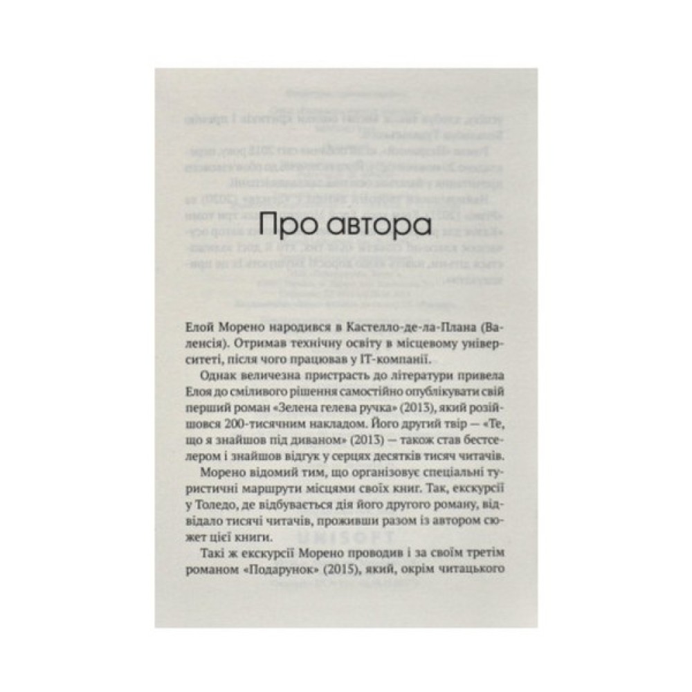 Гадаєте, що підліткова жорстокість залишається в середній школі? Ні, вона переслідує жертв протягом усього життя. Зостаючись незримою та непомітною для оточення, вона не зникає ані в минулому, ані в майбутньому, ані в сьогоденні. І коли зримими стануть усі шрами, кого упізнає кожен із нас? Перед вами відверта історія підлітка, який переживає булінг. Історія про тих, хто мовчить і не помічає, про тих, хто засуджує, про тих, хто завдає психічного та фізичного болю і шрамує пам’ять. Історія, яка вчить, хоч нікого й не повчає. Елой Морено народився в Кастелло-де-ла-Плана (Валенсія). Отримав технічну освіту в місцевому університеті, після чого працював у IT-компанії. Однак величезна пристрасть до літератури привела Елоя до сміливого рішення самостійно опублікувати свій перший роман «Зелена гелева ручка» (2013), який розійшовся 200-тисячним накладом. Його другий твір — «Те, що я знайшов під диваном» (2013) — також став бестселером і знайшов відгук у серцях десятків тисяч читачів. Морено відомий тим, що організовує спеціальні туристичні маршрути місцями своїх книг. Так, екскурсії у Толедо, де відбувається дія його другого роману, відвідало тисячі читачів, проживши разом із автором сюжет цієї книги. Такі ж екскурсії Морено проводив і за своїм третім романом «Подарунок» (2015), який, окрім читацького успіху, здобув також високі оцінки критиків і премію Беньяміна Тудельського. Роман «Незримий», який побачив світ 2018 року, перекладено 20 мовами світу. Його включено до обов'язкового прочитання у багатьох освітніх закладах Іспанії.