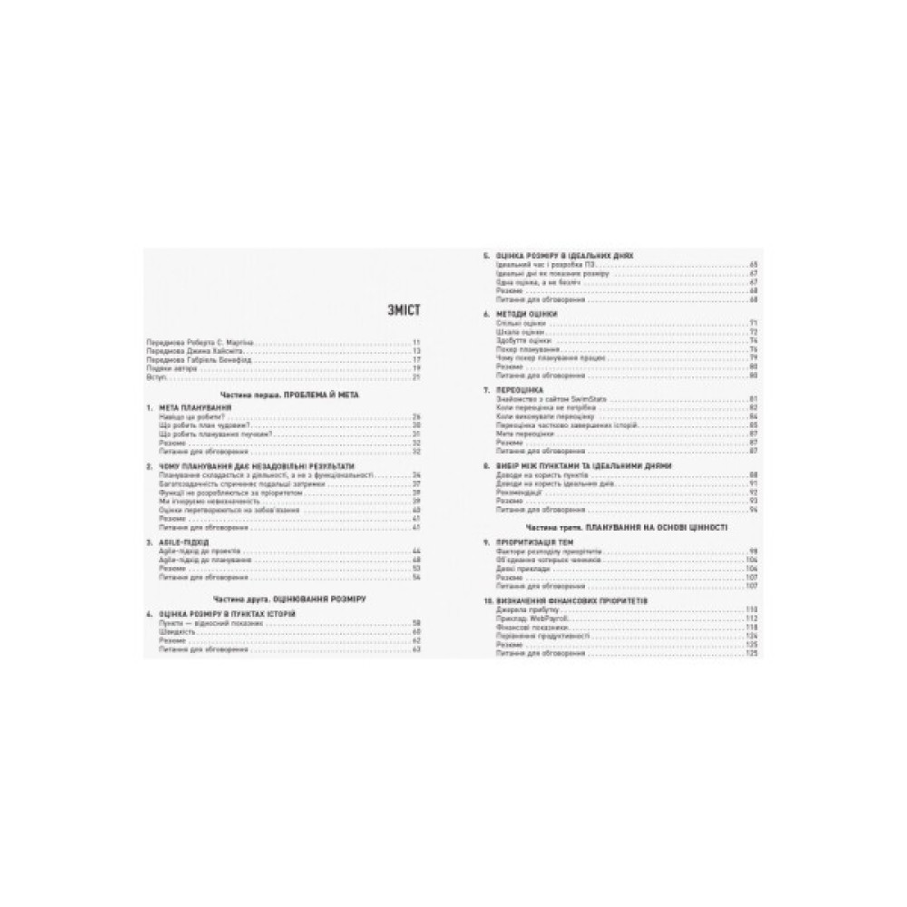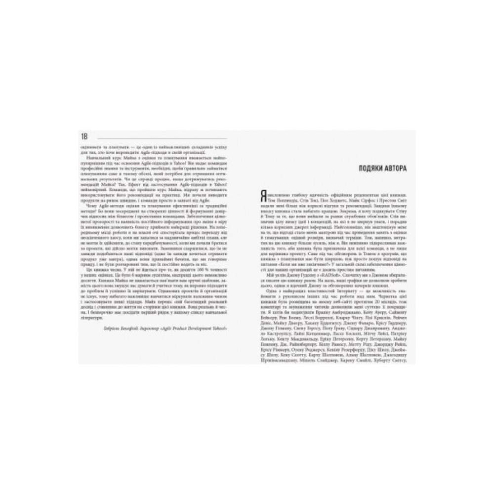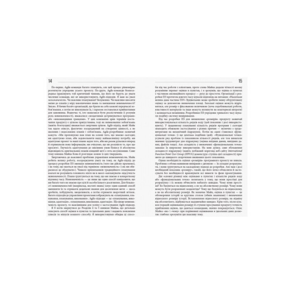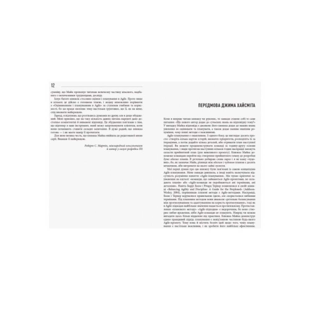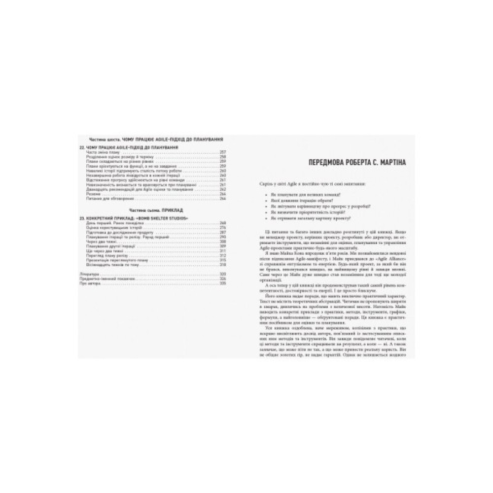 Книжка Майка Кона — одне з найкращих видань, присвячених гнучким підходам до розробки ПЗ. Автор презентує ретельно випробувані методи успішної роботи з декількома рівнями планування й оцінки, необхідними в Agile. Чи не вперше тут детально описані процеси Agile оцінки і планування, розкриваються таємниці створення, управління та поширення відмінного
