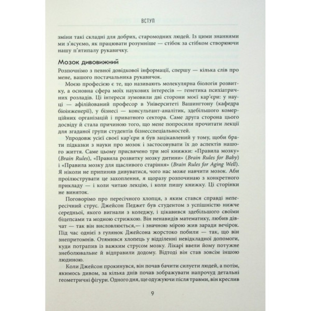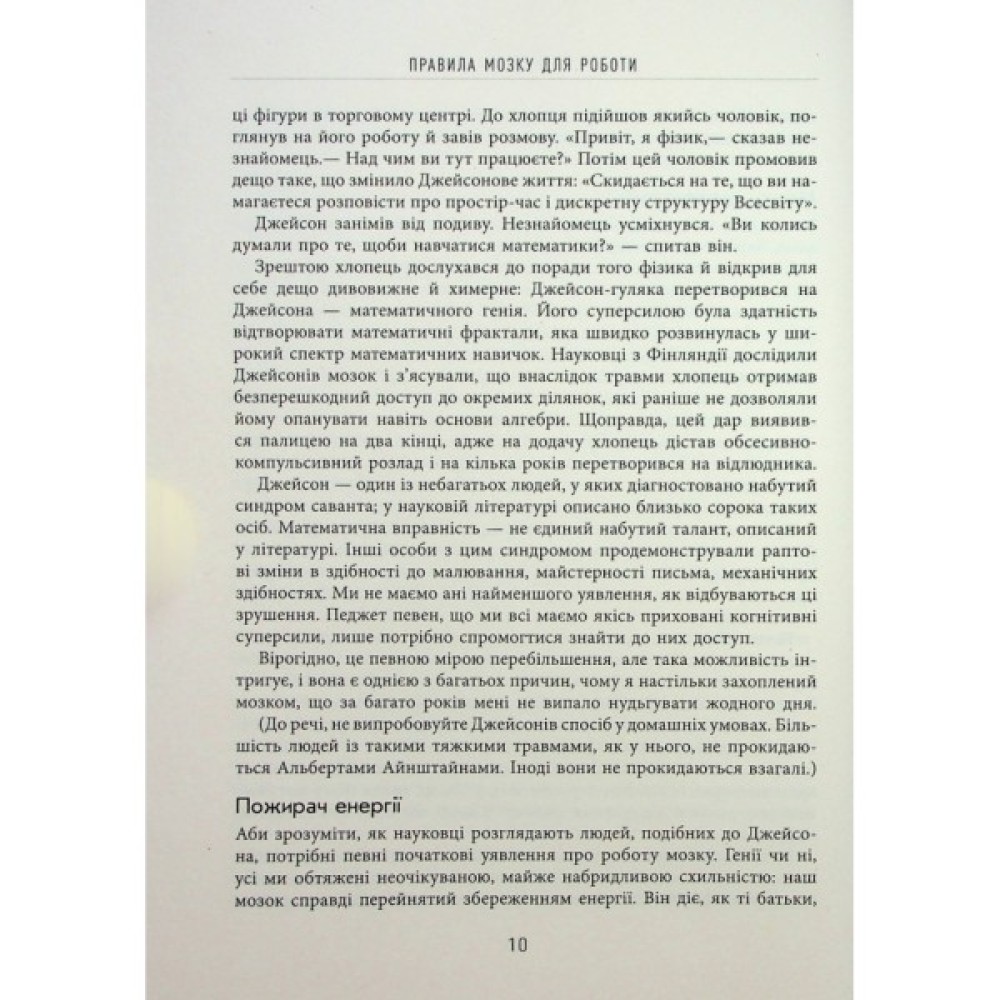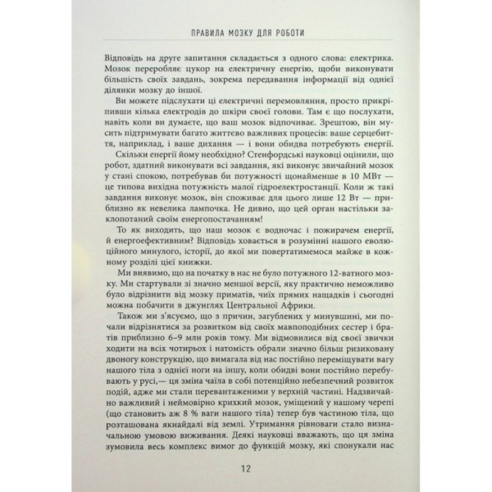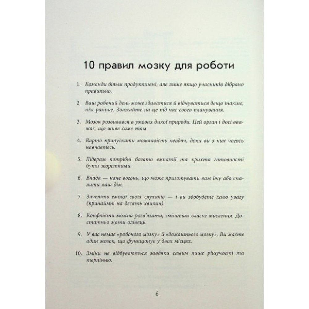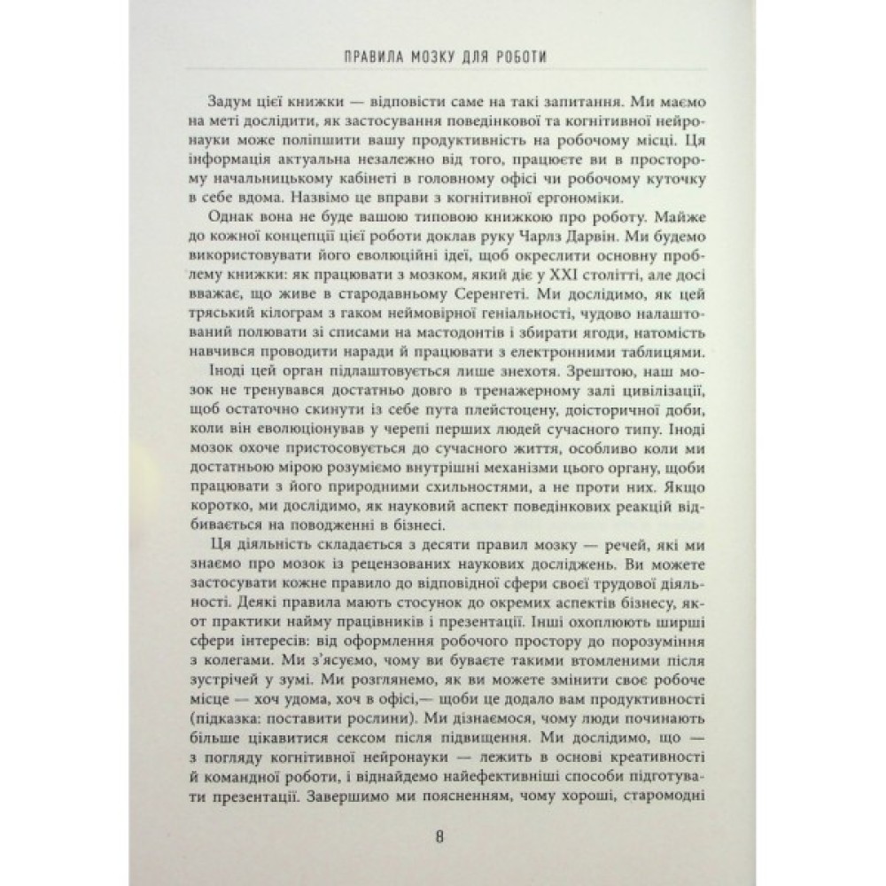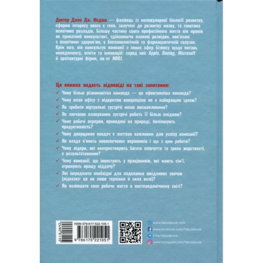 Що я маю зробити, аби віднайти баланс між особистим життям і роботою? Як мені зацікавити людей під час своїх презентацій? Що я можу змінити у своєму офісі, аби з нетерпінням чекати приходу до нього в понеділок? Як мені підвищити продуктивність своєї команди, свого відділу, своєї компанії? Відповіді на ці та багато інших запитань стосовно нашої роботи знають науковці. Автор, молекулярний біолог Джон Медіна, досліджує різні аспекти трудової діяльності крізь призму науково доведених фактів, спираючись на сучасні погляди наук про мозок та еволюційної біології стосовно організації офісного простору, динаміки влади, взаємодії на роботі під час і після пандемії COVID-19 та багатьох інших питань. Книжка «Правила мозку для роботи» містить чимало підказок щодо практичного застосування отриманої інформації, тож ви точно знатимете, що зробити наступного понеділка, аби покращити своє робоче життя та робоче життя тих, хто вас оточує.