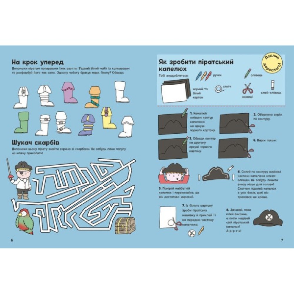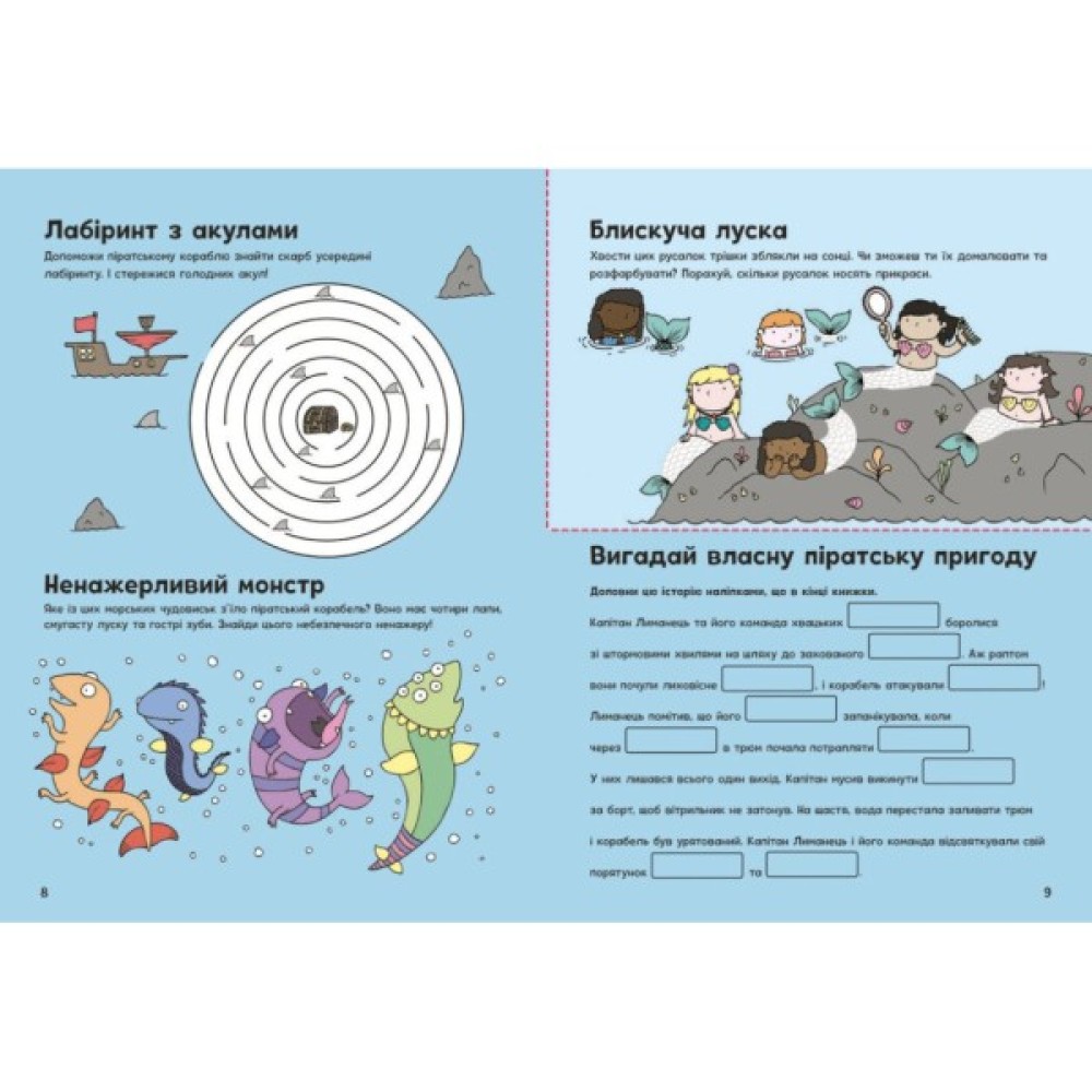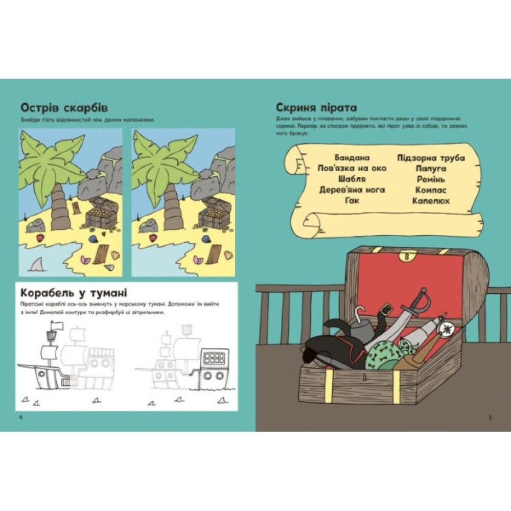 Йо-хо-хо! Мерщій на борт! Ми вирушаємо в захопливу морську подорож, де кожна сторінка — це нова піратська пригода! Тут для дітлахів є безліч пізнавальних скарбів: головоломки, лабіринти, розмальовки, вигадливі задачі й приклади... А також творчі завдання й саморобки. І все — про піратів і їхні пригоди! Дитина шукатиме відмінності між островами, розшифровуватиме таємні послання і навіть змайструє піратський корабель. А наліпки всередині зроблять подорож ще яскравішою. Гайда!