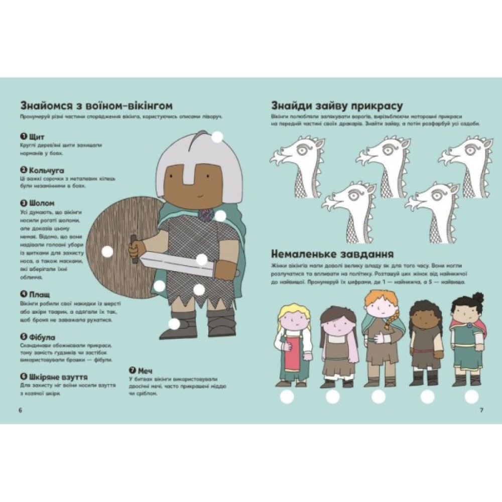 Ласкаво просимо у світ легендарних вікінгів! Ця книжка-активіті, ніби морський похід, сповнена викликів. Тут аж 64 сторінки із завданнями на логіку та уважність, лабіринтами, головоломками і навіть креативними саморобками. І все — про світ скандинавських воїнів. У яких богів вірили мореплавці? Встанови відповідність — і знатимеш. Де вікінг Ульф загубив гребінець? Доповни оповідь правильними рунами, щоб довідатись. Розплутай лабіринт і споряди вікінга до бою. І навіть змайструй власний щит!