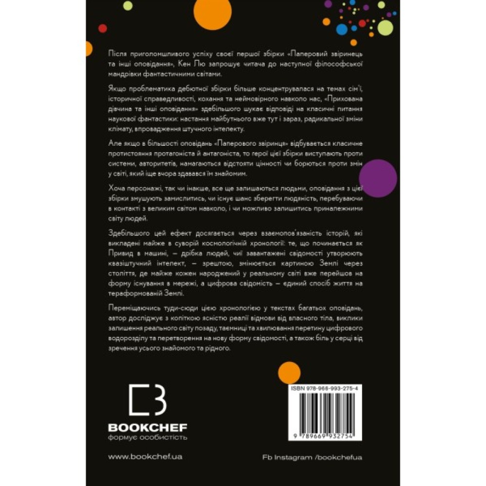 Після приголомшливого успіху своєї першої збірки — «Паперовий звіринець та інші оповідання», Кен Лю запрошує читача до наступної філософської мандрівки фантастичними світами. Якщо проблематика дебютної збірки більше концентрувалася на темах сім’ї, історичної справедливості, кохання та неймовірного навколо нас, «Прихована дівчина та інші оповідання» здебільшого шукає відповіді на класичні питання наукової фантастики: настання майбутнього вже тут і зараз, радикальної зміни клімату, впровадження штучного інтелекту.