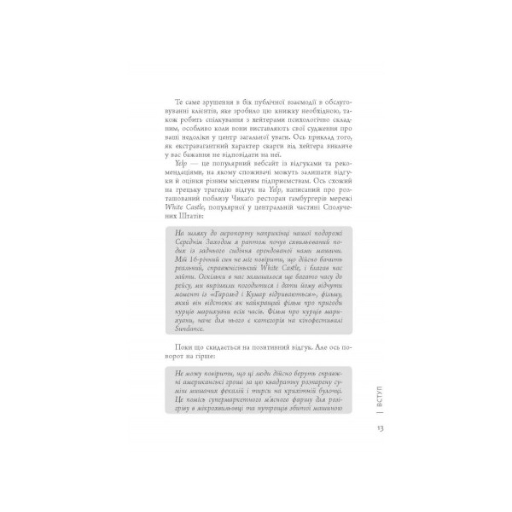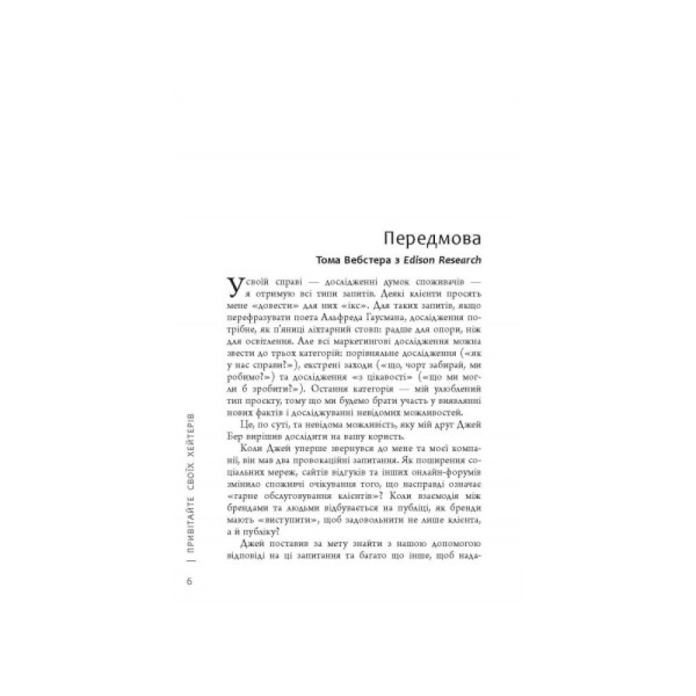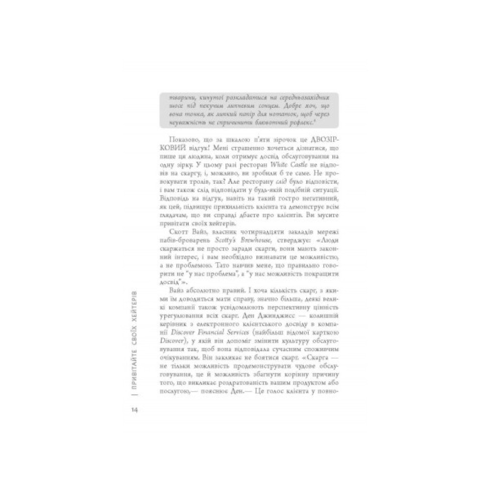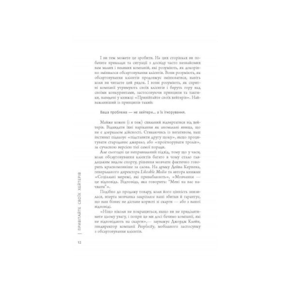 Відомий експерт Джей Бер подає видатні приклади привітання хейтерів і пояснює, як позитивне ставлення до них перетворюється на ваші гроші. Ви дізнаєтеся про типи хейтерів та загальні особливості їхніх скарг, правила поводження і тактику впливу на хейтерів. А опанувавши науку привітання хейтерів, ви зможете навіть найзапальніших з них приборкати і перетворити на своїх друзів і найвідданіших клієнтів.
