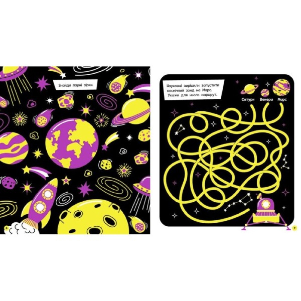 Головоломки з інопланетянами, математичні приклади з ракетами, лабіринти з планетами й космонавтами — усе це на суперяскравих флуоресцентних сторінках, які так до вподоби молодшим школярам.