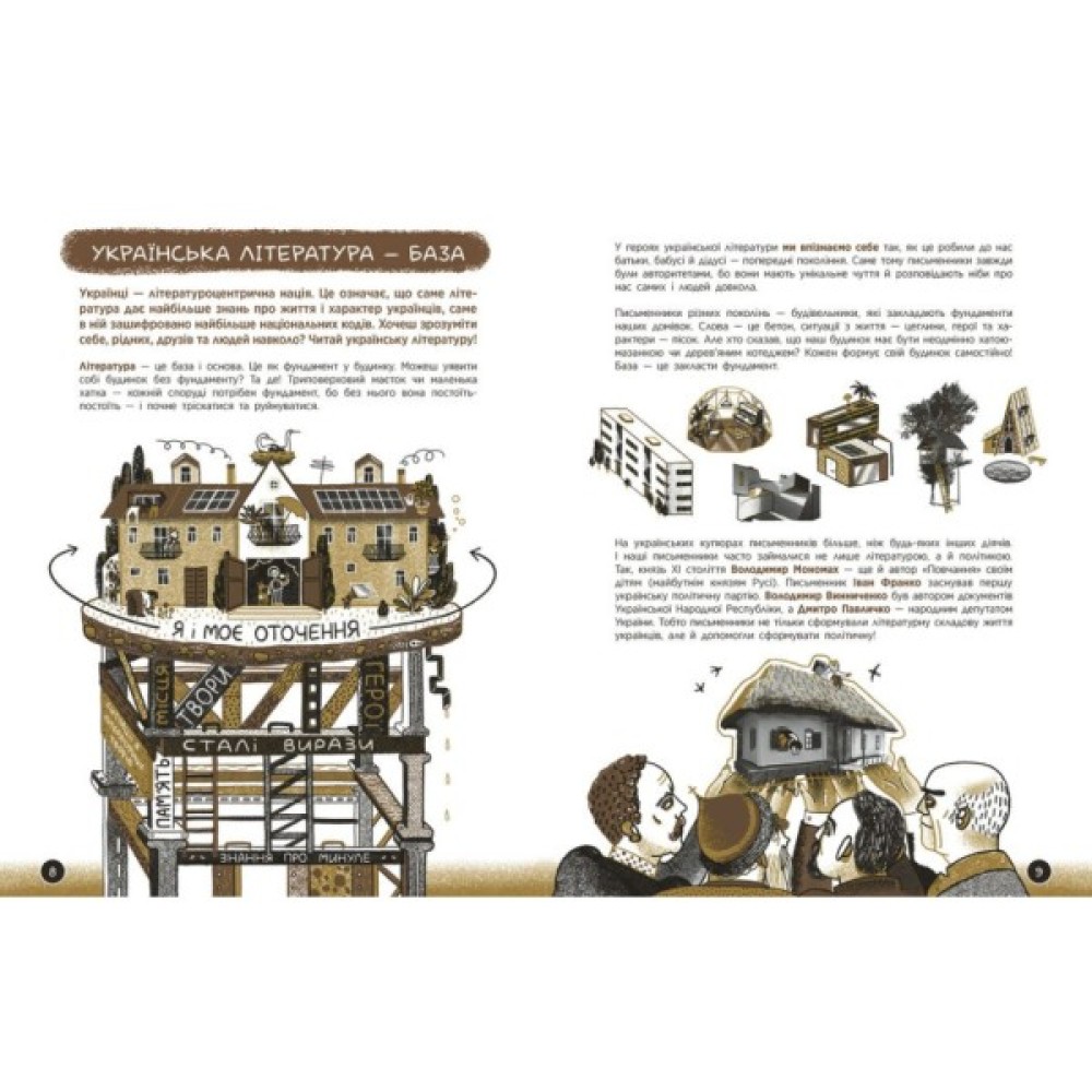 Тут авторка Анастасія Євдокимова — літературознавиця, культурна менеджерка, а в минулому вчителька української літератури — розповідає про жанри, форми, тематику творів, про долі й характери митців. І зрештою показує, як усе-усе довкола (епоха, погода і навіть страви в меню) впливає на те, що писали й пишуть наші письменники. Що таке класика? З чого складається детектив? Як читати комікс? Книжка пояснює поняття з літератури на прикладах українських творів. А кожна сторінка тут — ніби захопливий мультфільм, адже ілюстрації створила художниця-мультиплікаторка Софія Мельник.