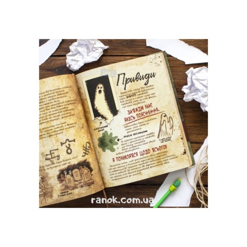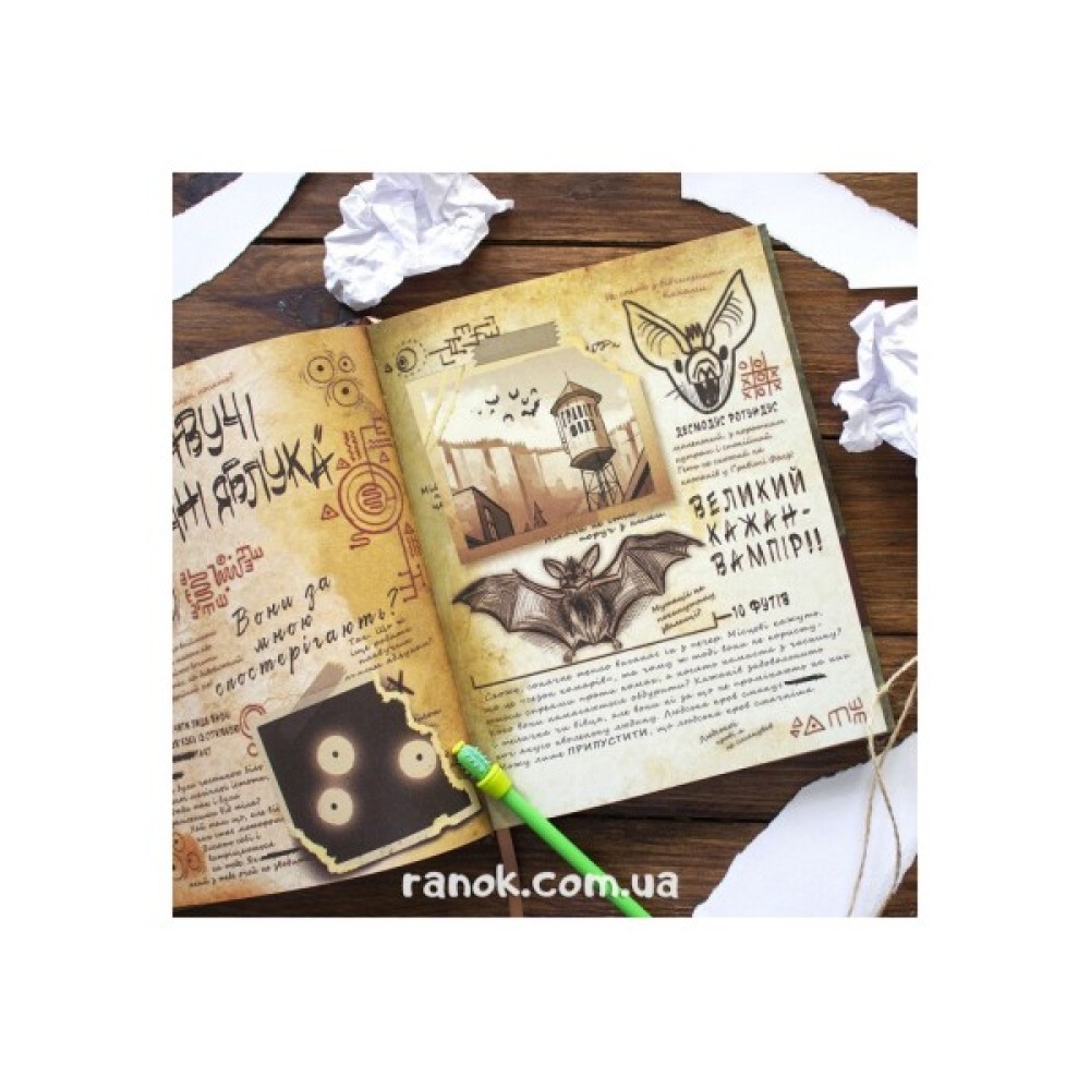 Якщо ви фанат шоу або вам просто подобається бути спантеличеним, задоволеним і наляканим ( у такому самому порядку), то вам пощастило! Ви тримаєте у руках заповітний щоденник автора, кольоровий, на 288 сторінках, повний секретів, чудовиськ і загадок, що про них раніше й не згадувалось. І все це відбувається в сонному містечку Ґравіті Фолз. Дізнаєтесь ви і про трагічну історію Форда, про місцезнаходження Блендіна, а також про те, що це за Вимір 52 і чим можна приманити "шлункоморду качку".