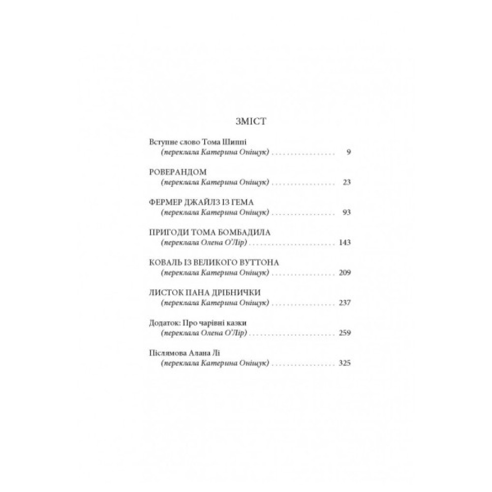 Це найповніше зібрання знаменитих коротких оповідей Дж. Р. Р. Толкіна. П’ять історій, що написані так само майстерно та вишукано, як і улюблений для багатьох «Гобіт», витворюють дивовижний світ, який не хочеться покидати: іграшковий песик Роверандом, подорожуючи на Місяць та в морські глибини, знаходить нових друзів і вчиться не сердити чарівників; Фермер Джайлз із Гема, ненароком прогнавши лихого велетня, змушений прикидатися героєм і ставати до бою з драконом; у «Пригодах Тома Бомбадила» йдеться про фантастичні мандри старого веселуна та про знайомство з гобітами, принцесами, ґномами і тролями; Ковалю з Великого Вуттона випало проковтнути чарівну зірку, яка стає йому перепусткою у Край фейрі; а Листок пана Дрібнички — це все, що залишилося у цьому світі від досконалого дерева маленького художника, у якого попереду, як і в усіх нас, довга неминуча подорож. Ці історії доповнює есей «Про чарівні казки», у якому славетний автор «Володаря Перснів» викладає теоретичні засади творчості.