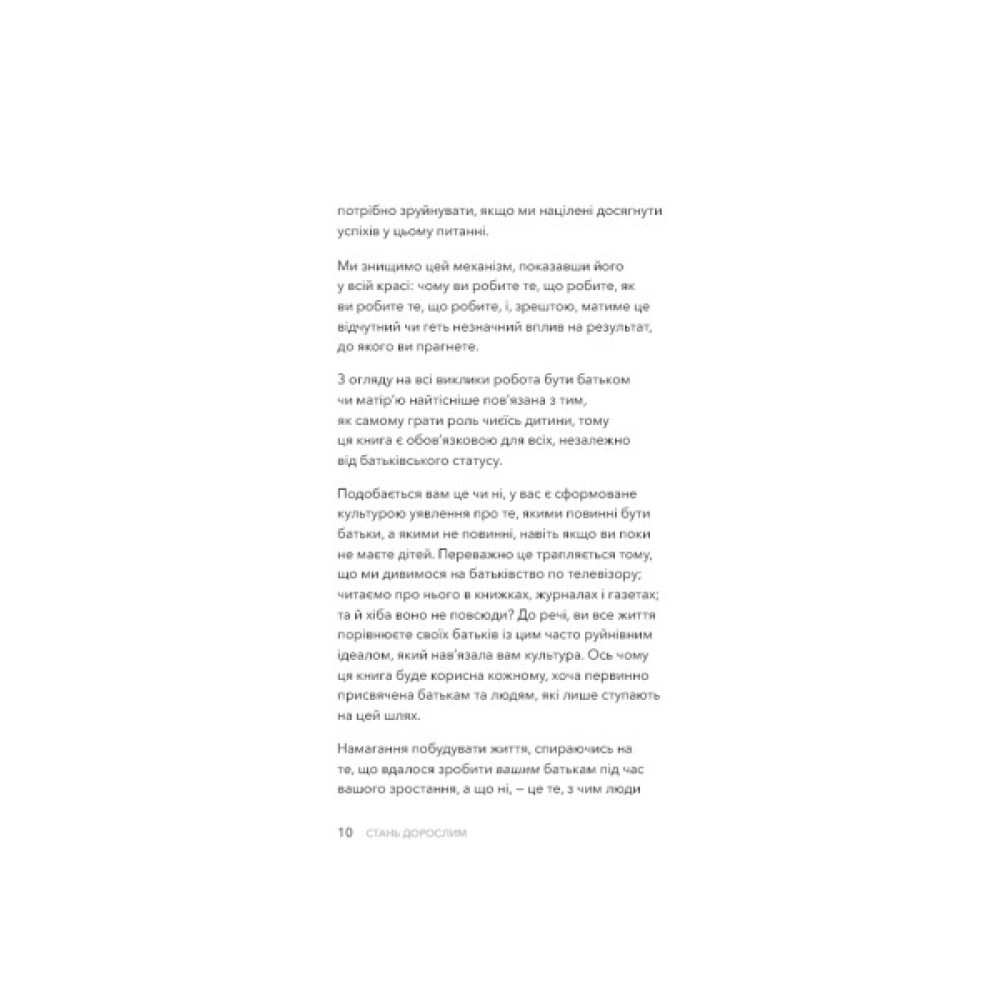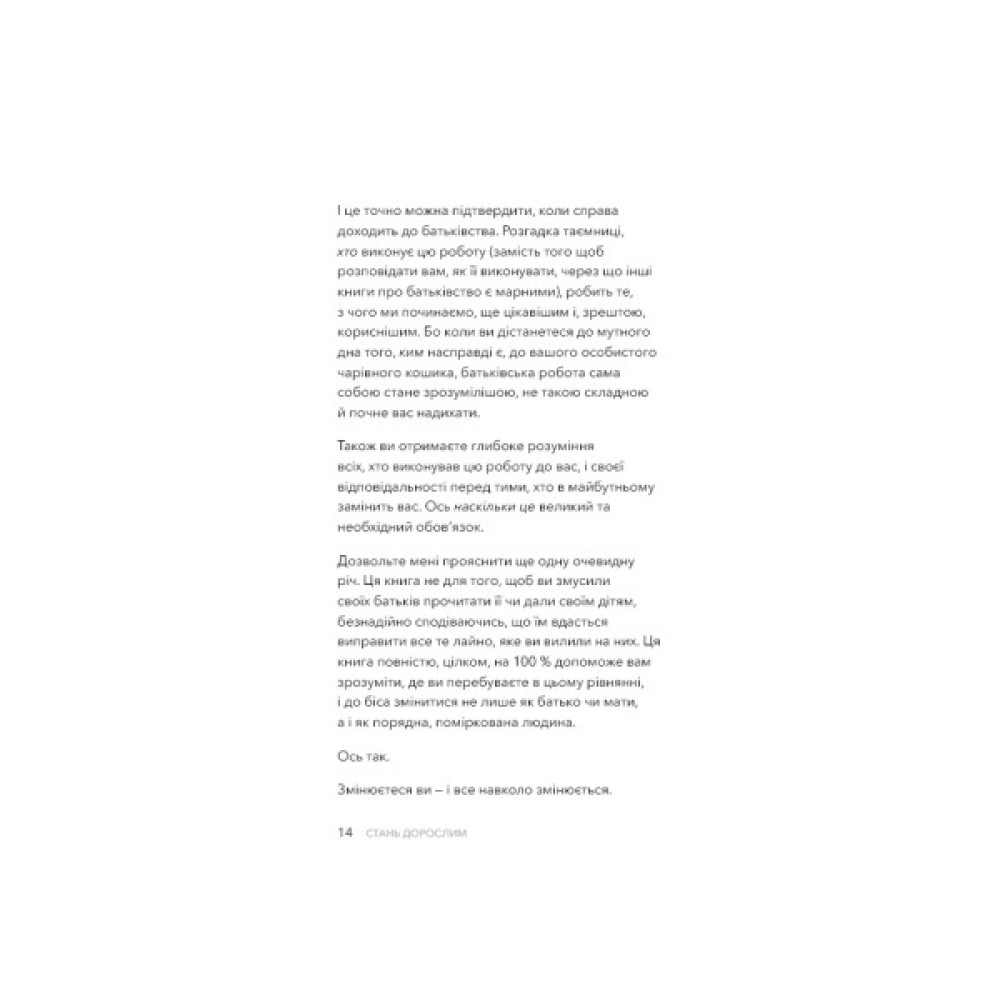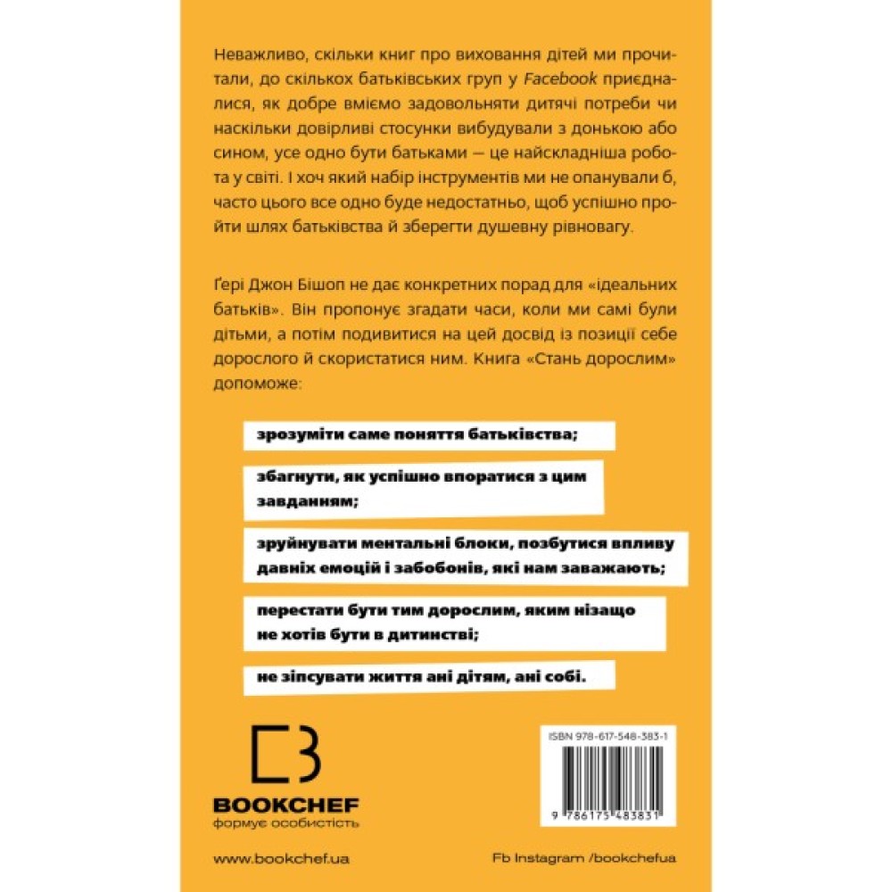 Ставши батьками, майже всі ми час від часу запитуємо себе, чи добре виконуємо своє основне батьківське завдання: виховати самодостатню, успішну, а головне — щасливу дитину? Ґері Джон Бішоп радить перевірений власноруч шлях пошуку відповіді на це запитання: самому стати самодостатньою, успішною і щасливою людиною. Для цього потрібно взяти на себе відповідальність за своє життя й показати дітям, як це робити, на власному прикладі.