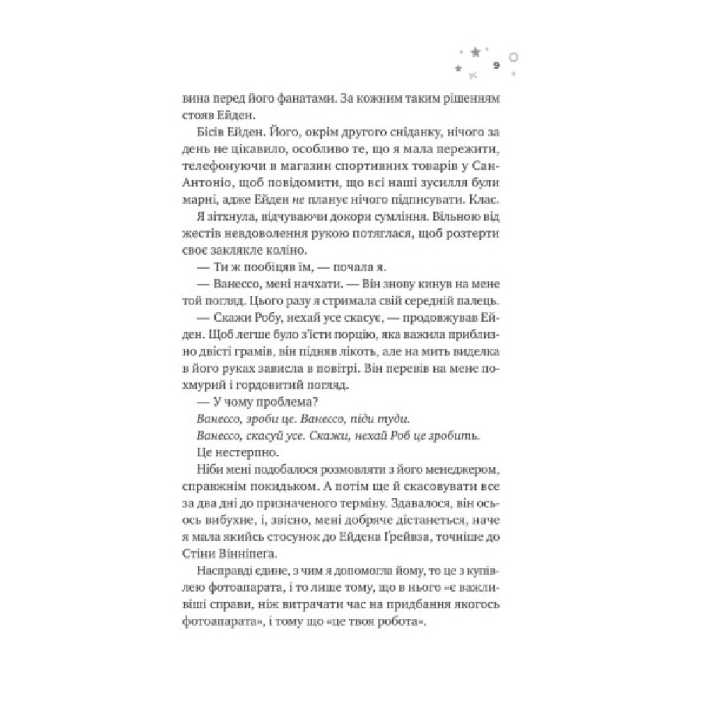 Ванесса Мазур завжди знала, що не буде вічно асистенткою величезного й холодного футболіста Ейдена Ґрейвза. І вона не має картати себе за власне звільнення. Годі бути помічницею, куховаркою, хрещеною матір’ю та нянькою найкращому захисникові Національної футбольної організації. У неї є плани на життя, й у жодному з них немає пункту про довічне прання гігантської білизни. Та коли Ванесса нарешті вирішує піти, футболіст на прізвисько Стіна Вінніпеґа з’являється на порозі її будинку з пропозицією, яку важко відкинути. Він потребує її для порятунку кар’єри, і це виходить далеко за межі професійної допомоги. Ванесса приголомшена: два роки Ейден не міг знайти в собі сили побажати їй доброго ранку чи привітати з днем народження, а тепер просить повернутися? Тисячі людей його обожнюють, але з неї досить. Однак що сказати людині, яка звикла отримувати все, що забажає?
