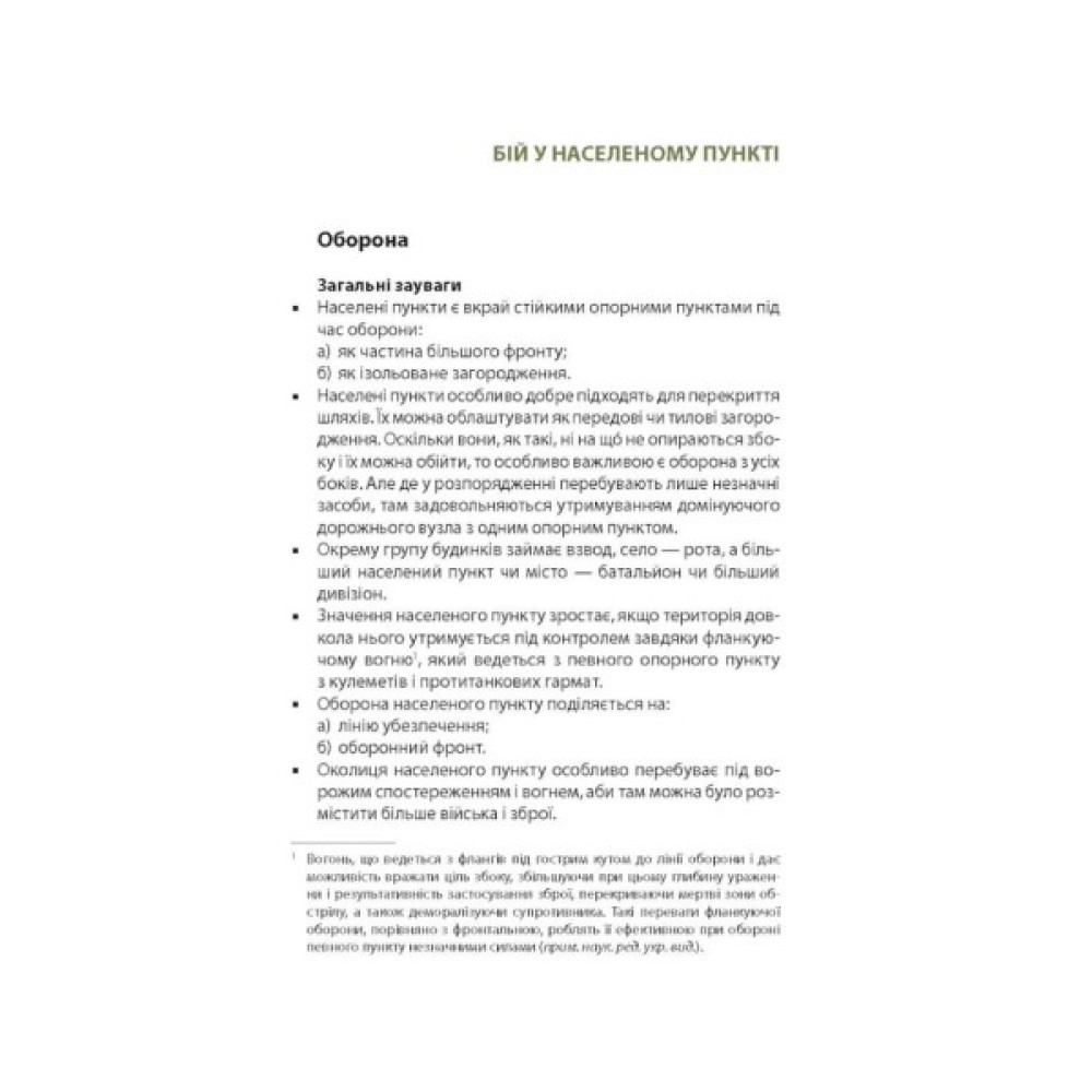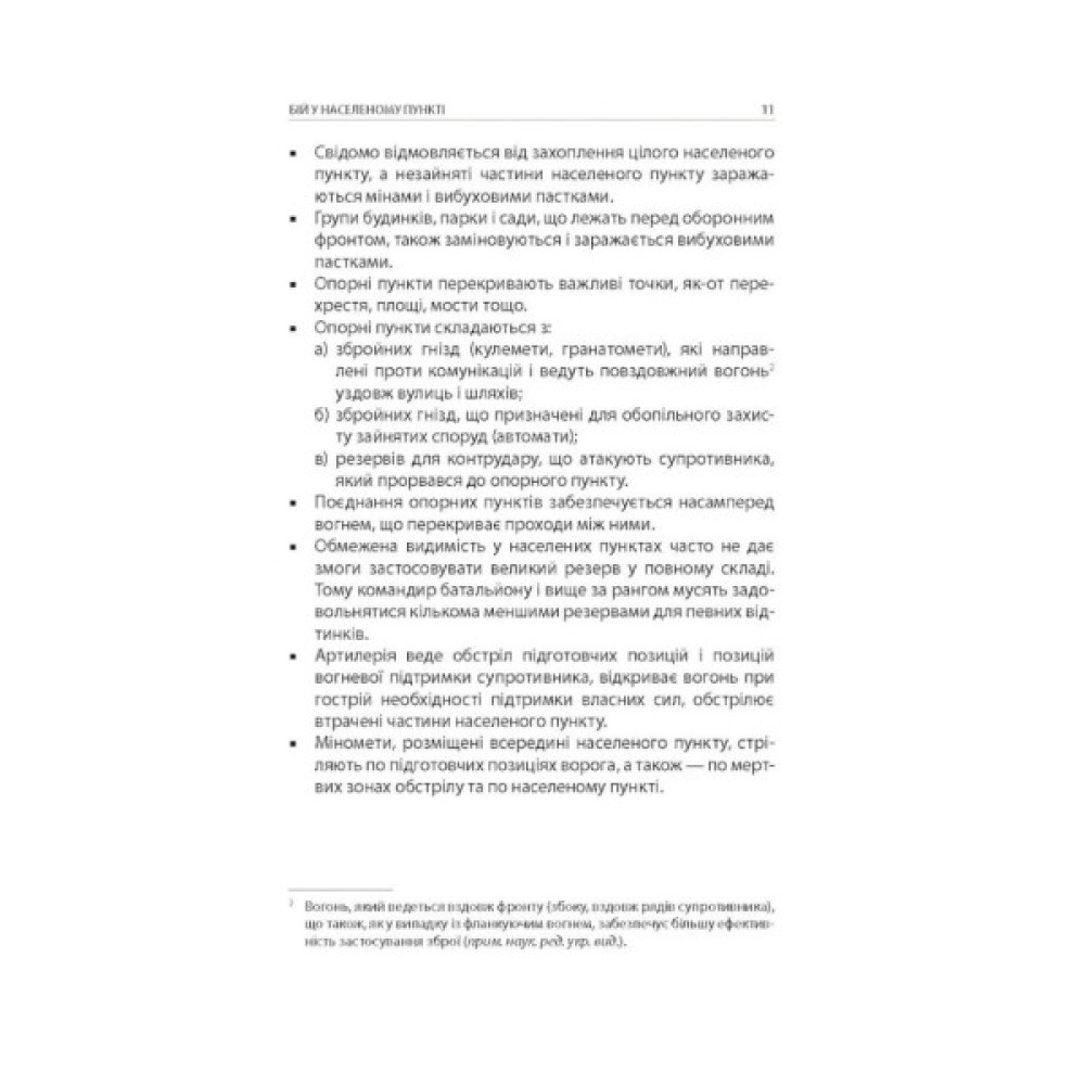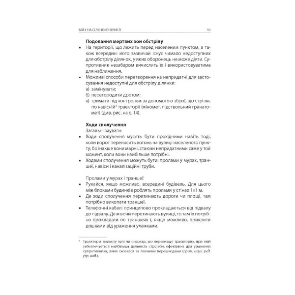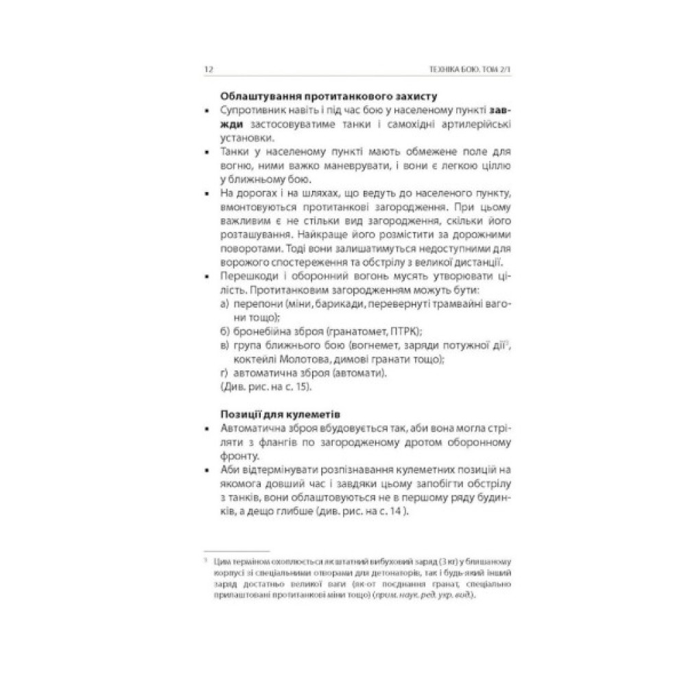 Професійний, але пристрасний текст військового фахівця і патріота має потужний мотиваційний потенціал, а доповнений рисунками, схемами і таблицями, він може бути легко засвоєний. Призначається для офіцерів, сержантів, рядових Збройних Сил України, а також усіх, хто хоче належно підготуватися до захисту своєї країни від агресії ворога та збільшити свої шанси на виживання у бою. У цій частині розкриваються основи ведення бойових дій у населеному пункті та лісі, а також особливості боротьби за фортифікаційні споруди.