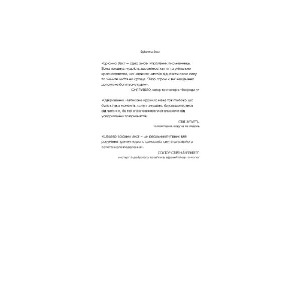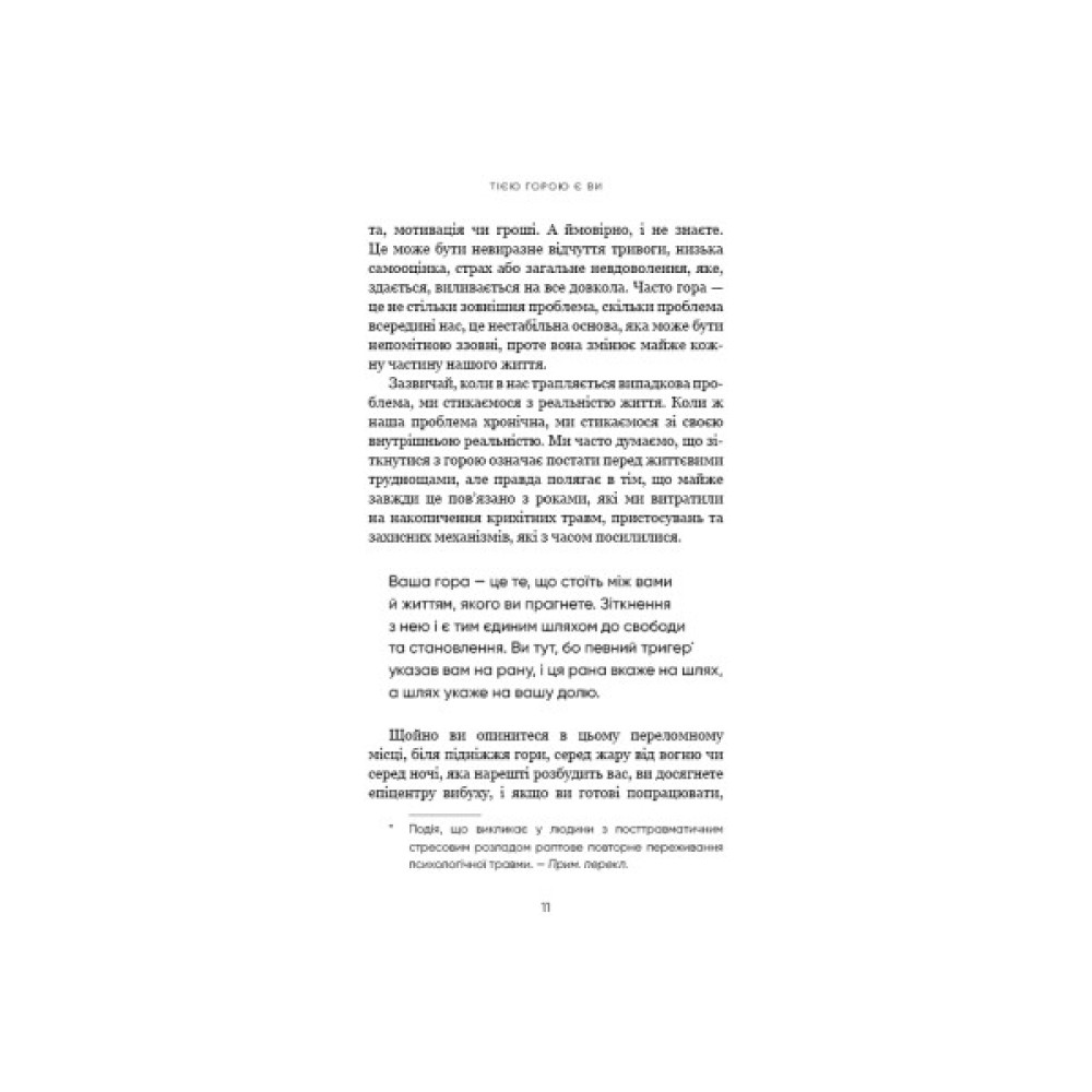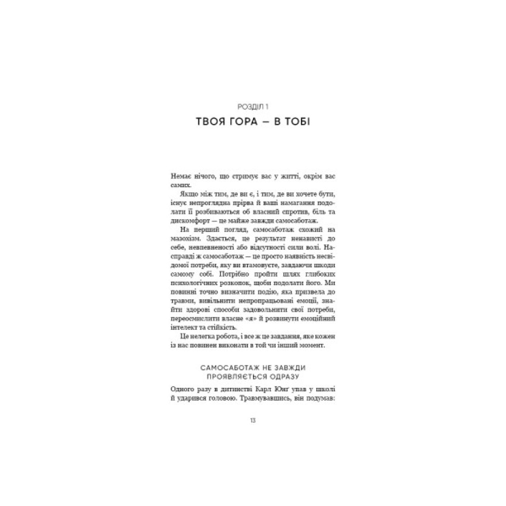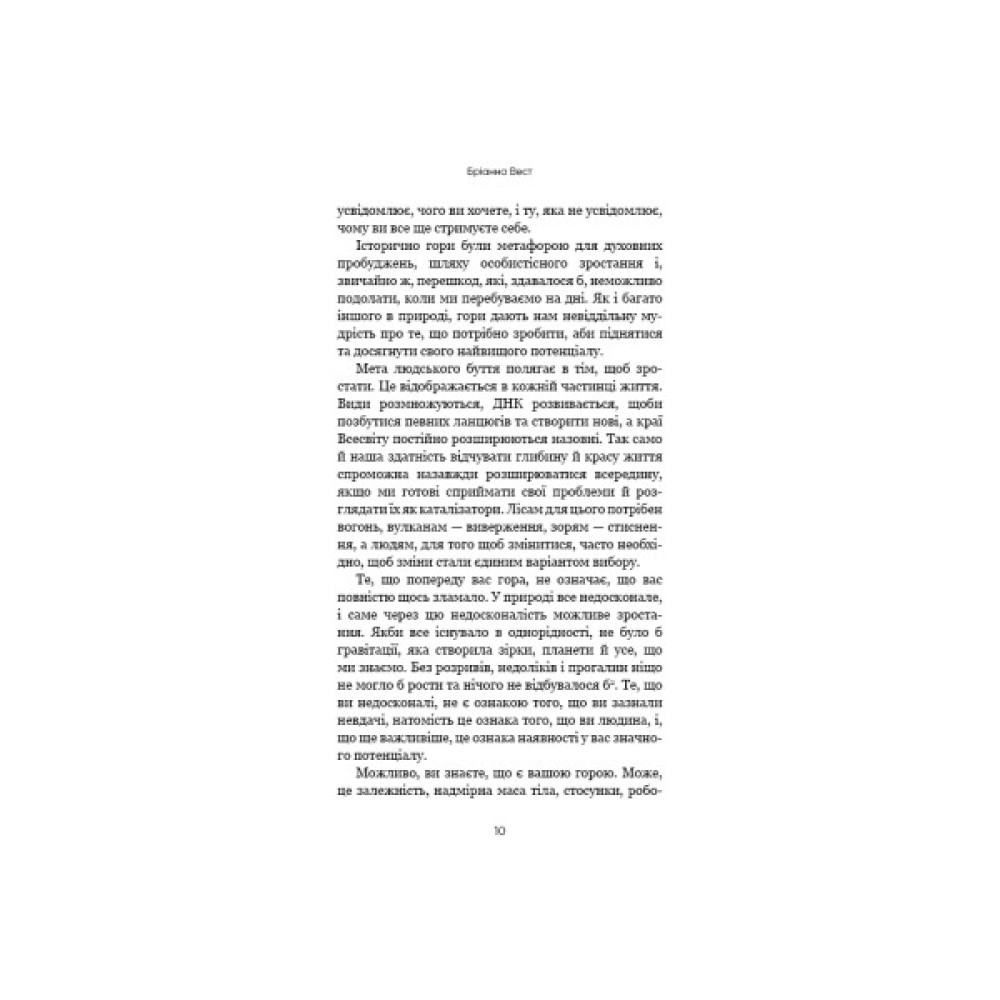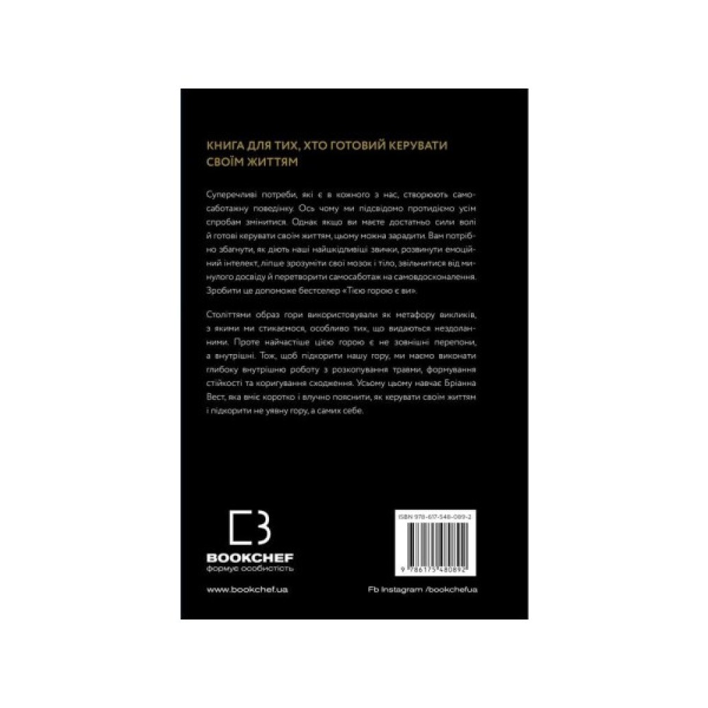 Бріанна Вест, авторка світових бестселерів, пропонує насамперед проаналізувати наші внутрішні налаштування, які складаються зі звичок, емоційного інтелекту й травматичного досвіду, а потім опанувати методи, які допоможуть здолати внутрішню гору й досягти намічених цілей.