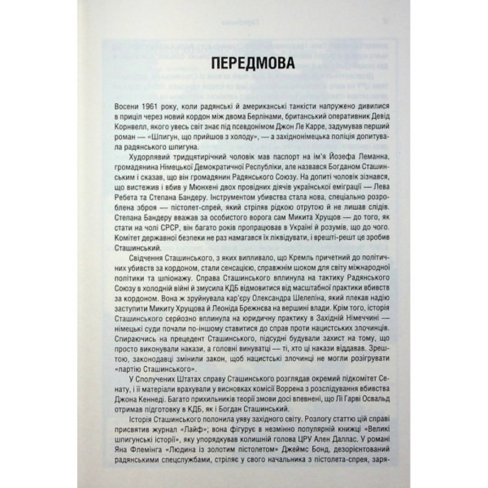 На основі архівних матеріалів та протоколів суду Сергій Плохій розповідає історію одного з найвідоміших агентів КДБ, вбивці Степана Бандери і Лева Ребета - Богдана Сташинського. Детально і вичерпно описаний день, коли був убитий провідник ОУН, а також слідство, що велося після події. Автор пропонує новий погляд на долю Сташинського, чия історія є головною у цьому творі.