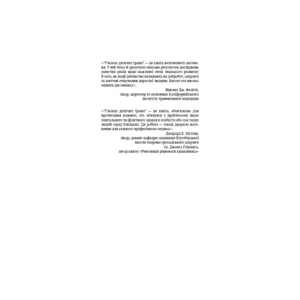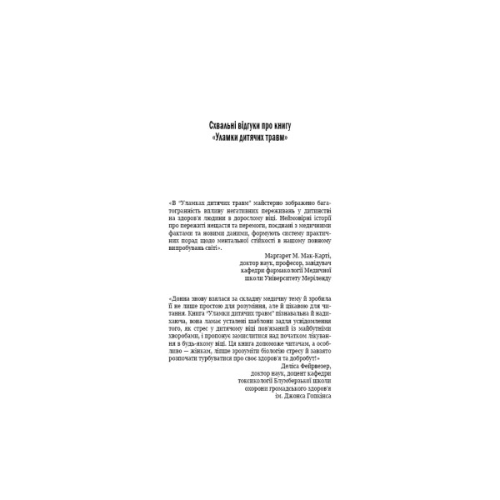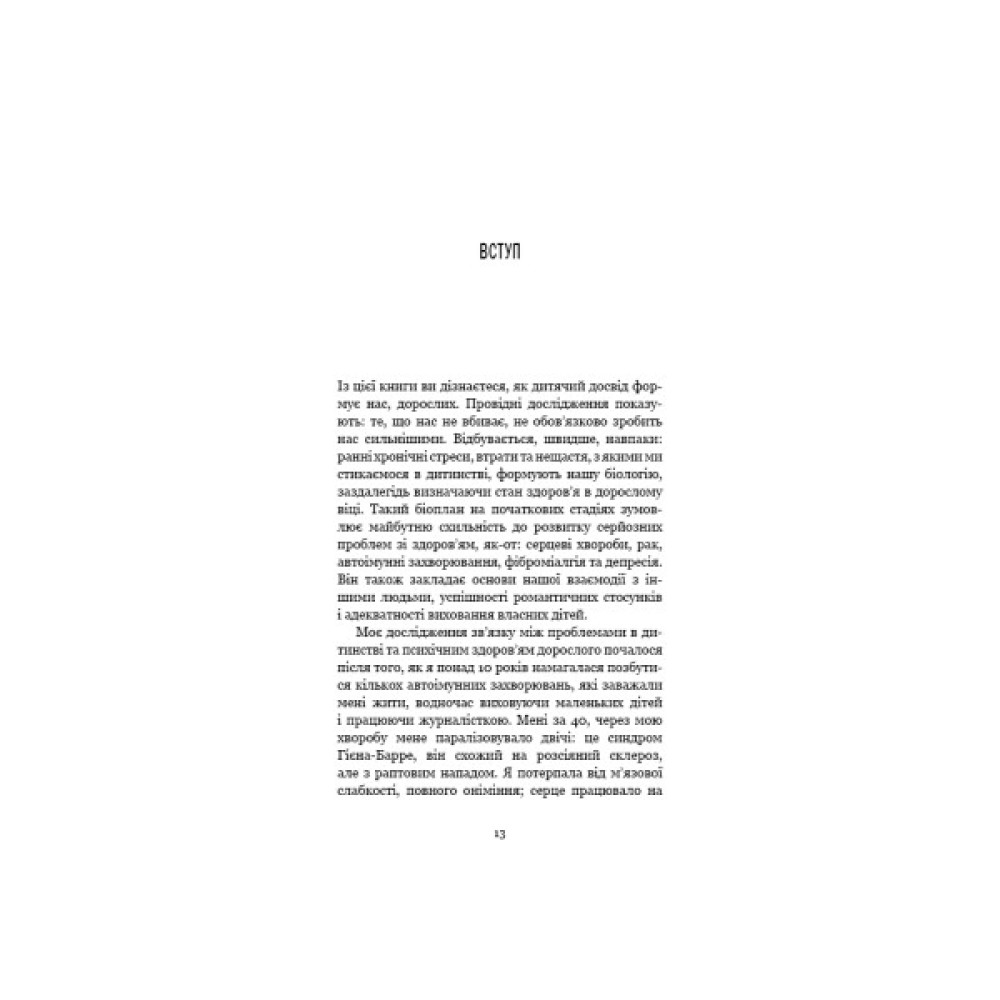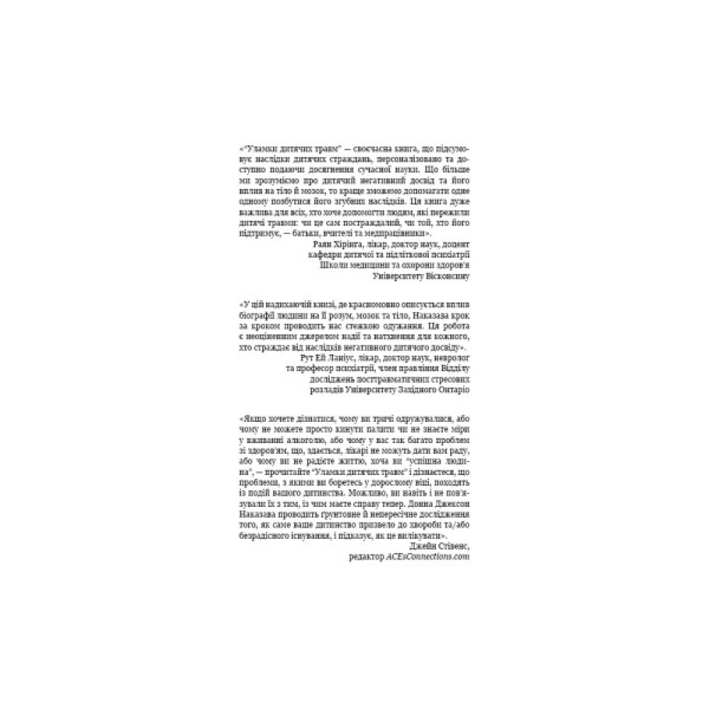 Дитинство вважають найщасливішим і найбезтурботнішим періодом життя. Однак це не завжди так. Стреси, як-от сварки чи розлучення батьків, жорстоке поводження в сім’ї чи знущання ровесників, смерть рідних або близьких, часті переїзди тощо, стають причиною психічних розладів і фізичних недуг, навіть якщо безпосереднього зв’язку між ними дорослі не бачать. У книзі «Уламки дитячих травм» дослідниця Донна Джексон Наказава зібрала історії людей, яким удалося знайти цей зв’язок і розірвати його. Авторка докладно розповідає, як впливає на нас «застрягання» в негативному минулому, чому ми не можемо позбутися болючих спогадів, чим відрізняється переживання стресу хлопчиками та дівчатками й що саме потрібно зробити, аби змінити ситуацію.