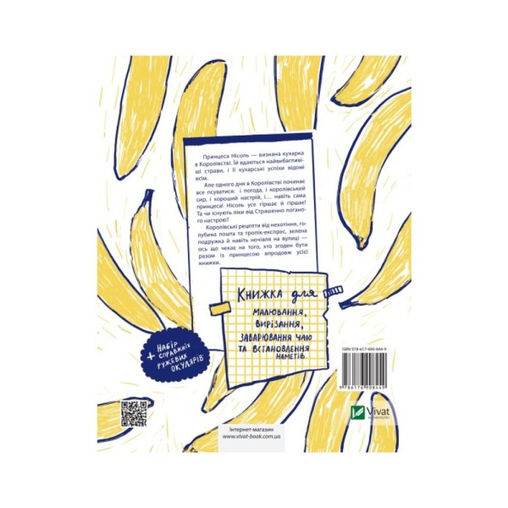 Дивовижна книжка, яку можна не лише читати, а й розфарбовувати, клеїти та домальовувати. Мерщій дізнайся про пригоди принцеси Нісоль, яка була головним кухарем Королівства, а також підступного Нехочуки й веселої Банани.