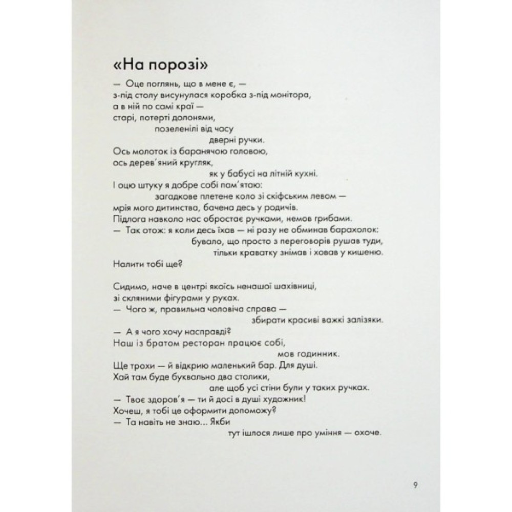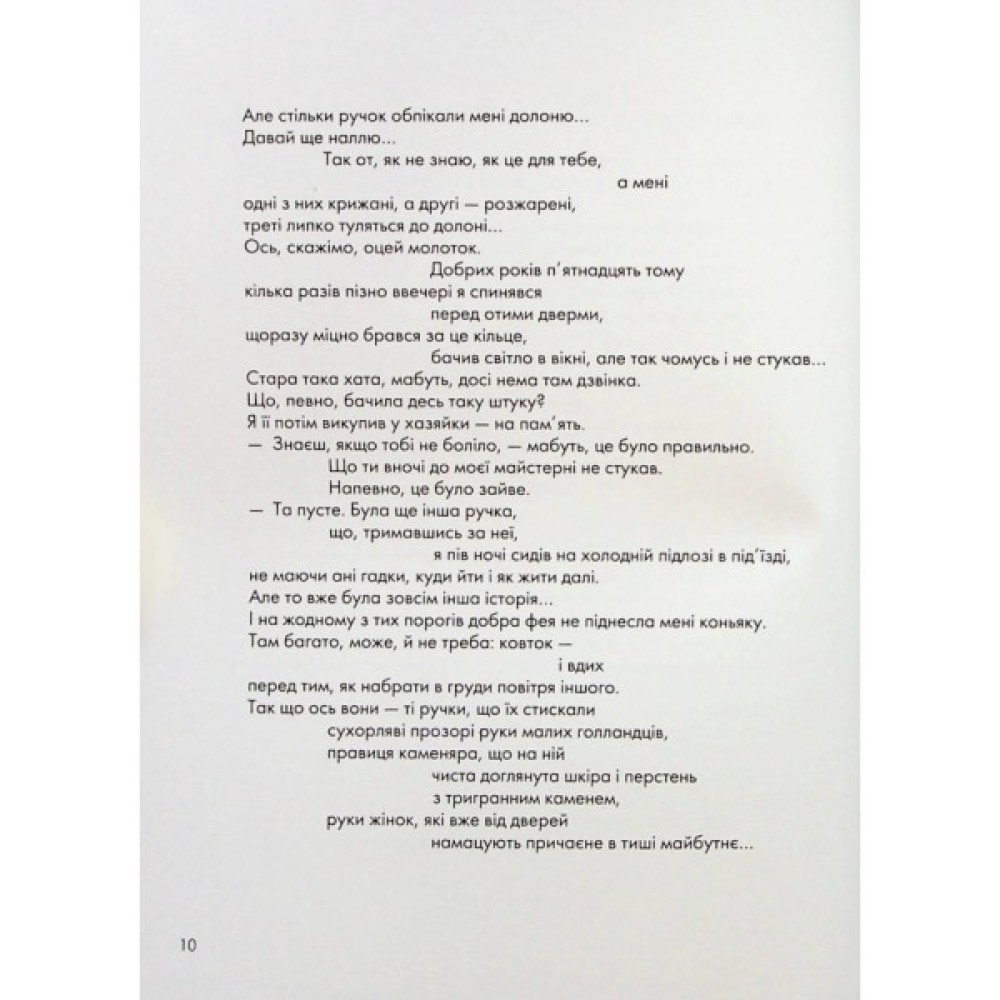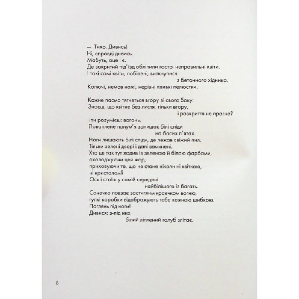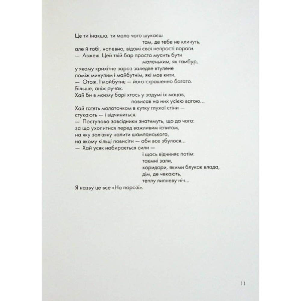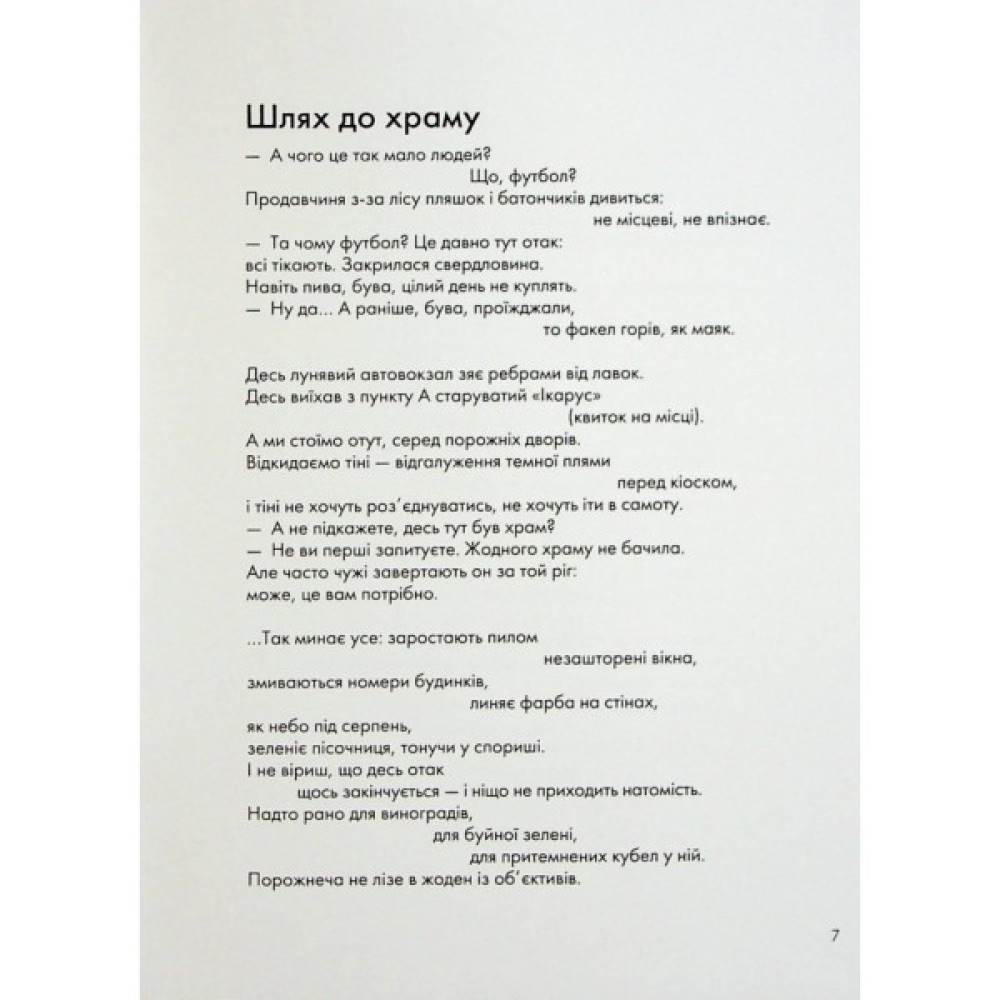 У віршах цієї книжки багато рідкісних істот, місць, куди вже не повернутись, і річок, у які ми ніколи не ввійдемо вдруге, — навіть сама авторка на це не здатна. Тим, хто пам’ятає подорожі без мобільних телефонів і Крим без окупантів, — на добрий спогад. Китам, сомам, совам — як привід відчути свою обраність. Усім іншим — для того ж, для чого дорога, вечірній в’їзд до незнайомого міста і хвилі прибою на піску.