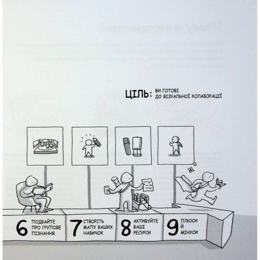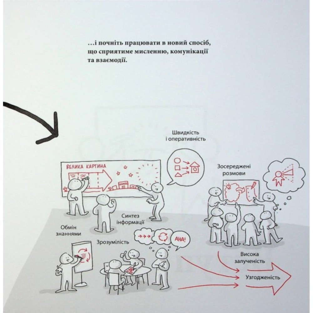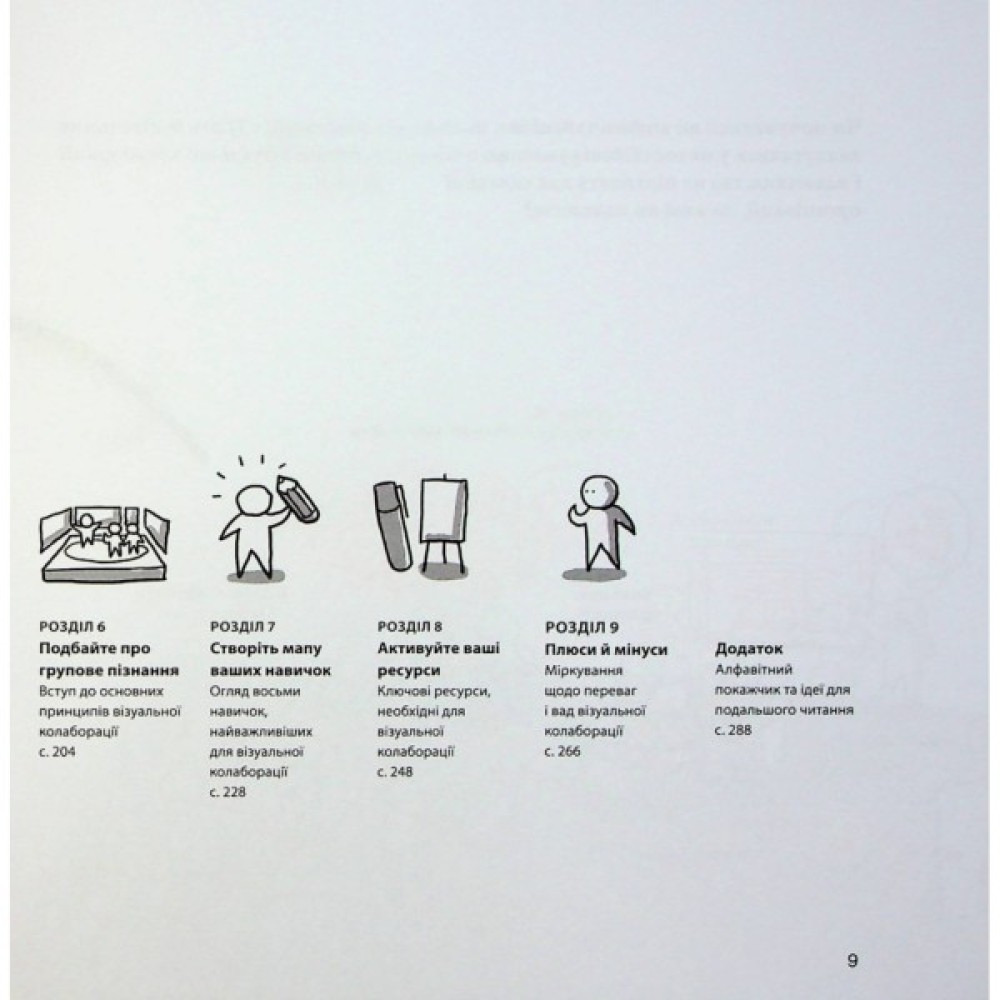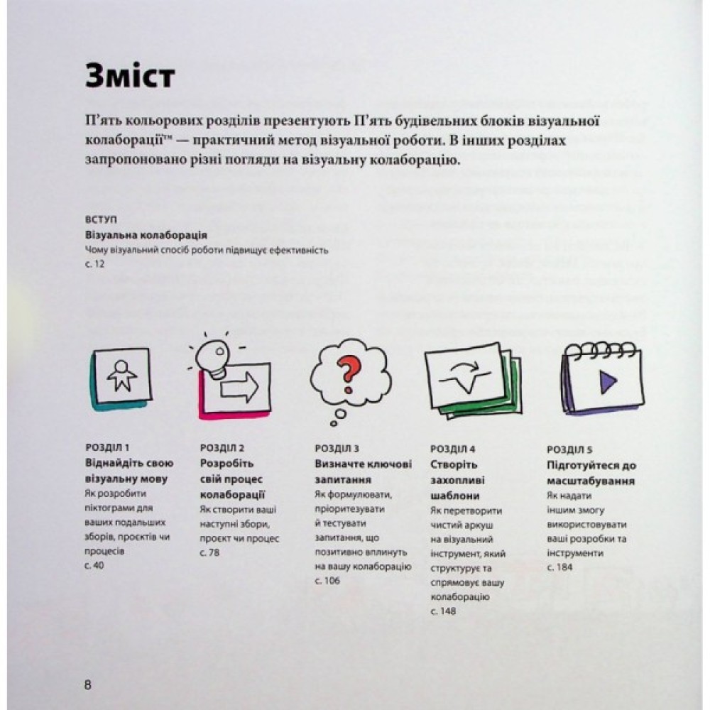 У книжці показано, як прискорити командний діалог, а також залучити учасників за допомогою простих прийомів і прикладів. Візуальна колаборація потужно працює в широкому діапазоні налаштувань, зокрема під час зустрічей, стратегічних сесій, планування проєктів, інновацій і бізнес-планування. Ядро книжки — практичні й прості в застосуванні П'ЯТЬ БУДІВЕЛЬНИХ БЛОКІВ, найвірогідніше, стануть вашим улюбленим способом роботи.