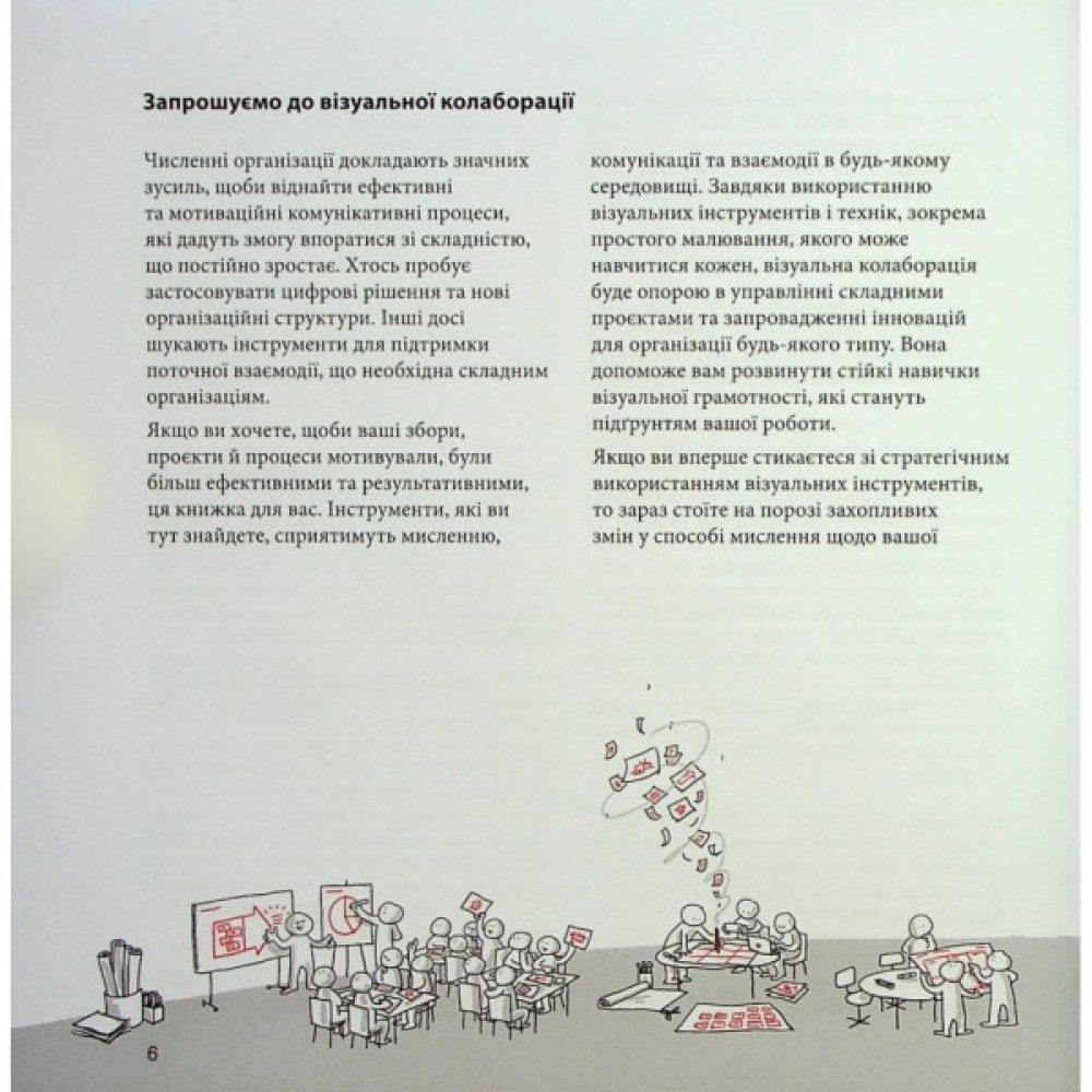 Книжка «Візуальна колаборація» представляє новий та інноваційний спосіб роботи й співпраці, який допоможе вам успішно керувати складністю для себе, своєї команди та ­всієї організації. Вона пояснює, як будь-яка команда може створити візуальну мову для поліпшення спілкування та співпраці над своїми найважливішими цілями. Ця книжка дозволить вам розробляти візуальні мови, щоби відповідати будь-якому сценарію, створювати привабливі й потужні запитання, щоби допомогти візуальному дизайну процесу й перетворити біле полотно на шаблон, який може поліпшити будь-яку зустріч, проєкт або процес. Щоби подолати опір членів команди, які стверджують, що «не вміють малювати», автори розробили простий у застосуванні метод, який допомагає будь-кому малювати майже все.