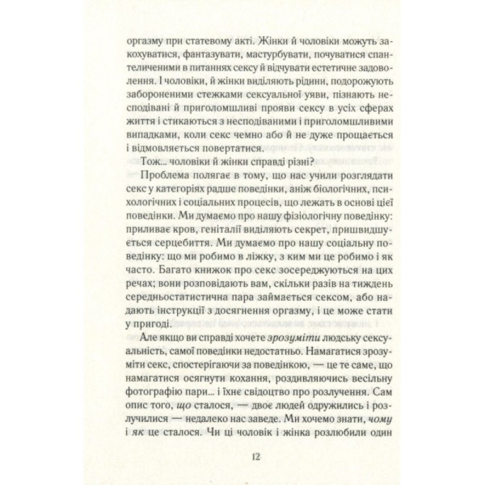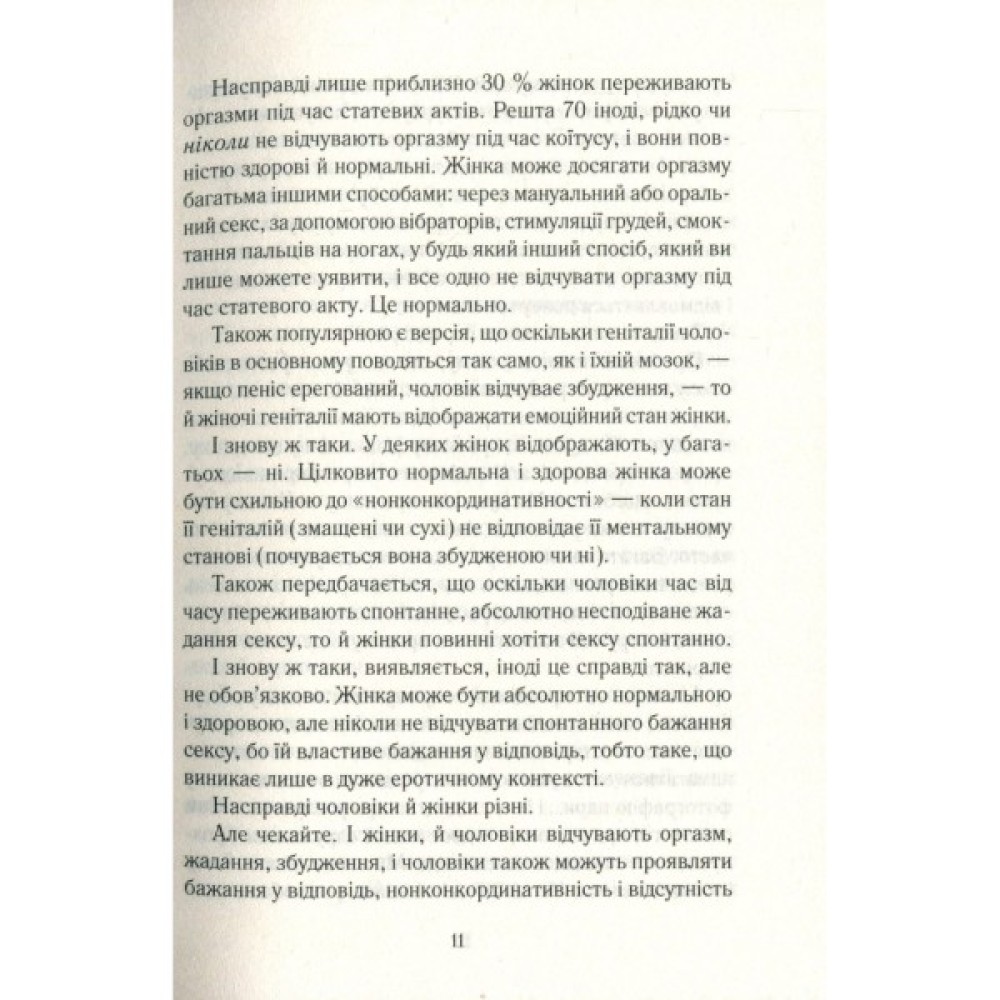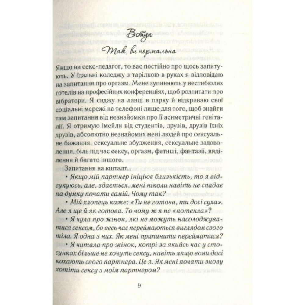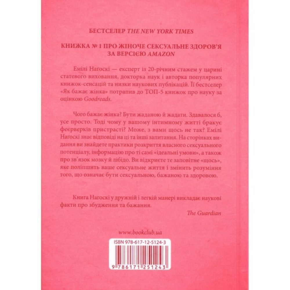 Емілі Наґоскі знає відповіді на ці та інші запитання. Про всі «секретики» і «точки» жіночого тіла, про сексуальне бажання, механізм його дії та ідеальні умови для його пробудження. На сторінках видання ви знайдете практики розкриття власного сексуального потенціалу, інформацію про ті самі «ідеальні умови», а також про зв’язок мозку й лібідо. Історії реальних жінок, їхні запитання й відповіді на них поряд із результатами досліджень кваліфікованих фахівців... Ви відкриєте те заповітне щось, яке поліпшить ваше сексуальне життя і змінить розуміння того, що означає бути сексуальною, бажаною та здоровою.