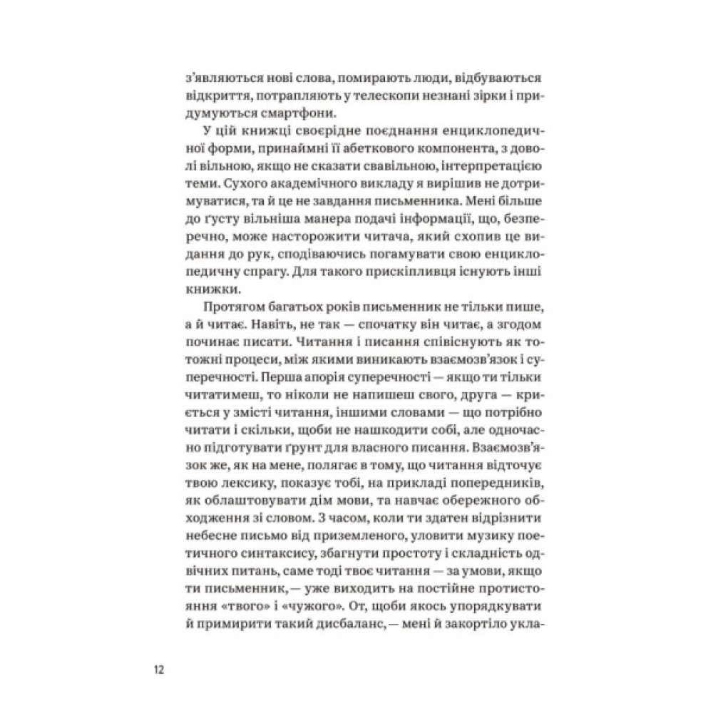 У передмові автор, звертаючись до читача, зазначає: «Протягом багатьох років письменник не тільки пише, але й читає. Навіть, не так – спочатку він читає, а згодом починає писати. Читання і писання співіснують як тотожні процеси, між якими існує взаємозв’язок і суперечності. З часом, коли ти здатен відрізнити небесне письмо від приземленого, вловити музику поетичного синтаксису, збагнути простоту і складність вічних питань, саме тоді твоє читання, за умови, якщо ти письменник, уже виходить на постійне протистояння "твого" і "чужого"».