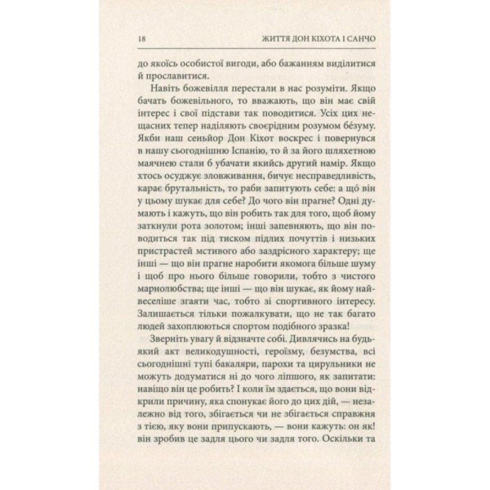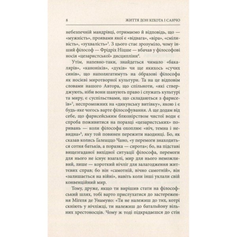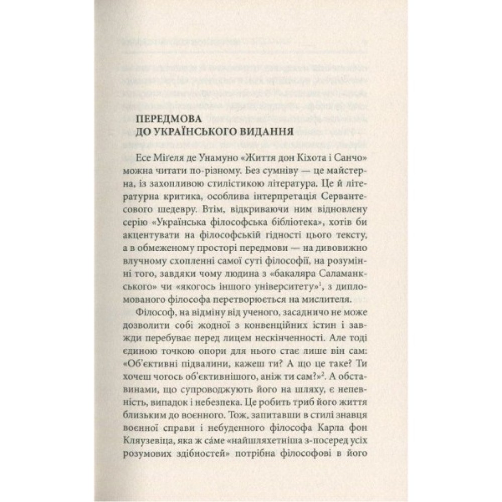 «Життя Дон Кіхота і Санчо» (1905) іспанського письменника, філософа і політичного діяча Міґеля де Унамуно-і-Хуґо (1864-1936) є своєрідним філософським коментарем до знаменитого Сервантесового роману «Премудрий гідальго Дон Кіхот з Ламанчі», спробою розкрити не помічений іншими критиками сенс. Водночас це самостійний твір, що шукає в цій пам’ятці радше джерело натхнення, сприймаючи її за матеріал для будівництва власної філософської концепції. Тут бéзум протиставлено раціоналістичному животінню обивателя, сни стають реальністю, трепетне прагнення вічності проймає єство індивіда, спонукаючи шукати опертя для свого існування поза всіма можливими горизонтами, а народи, здіймаючись над своєю розпорошеністю, зважуються на власні героїчні витівки.