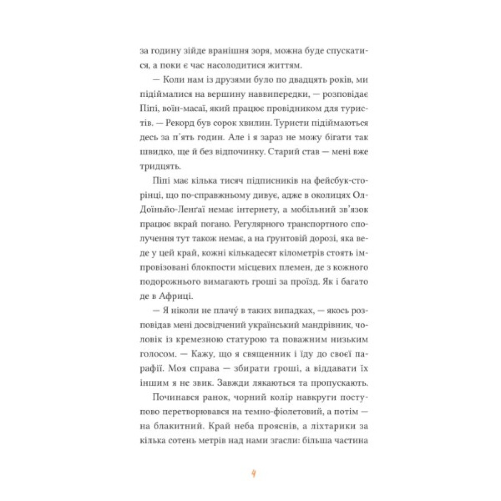 Споглядання за життям диких тварин на сафарі, сходження на вершину священного для народу масаїв вулкана, візити до племен, кавова церемонія на схилі гори, рафтинг порогами Нілу, контакти з не дуже безпечними людьми. Не оминаючи болісних тем, автор розповідає про колонізацію та деколонізацію Африки, проблеми постколоніальних країн, а також про те, чому годі шукати книжок, написаних мовою суахілі.