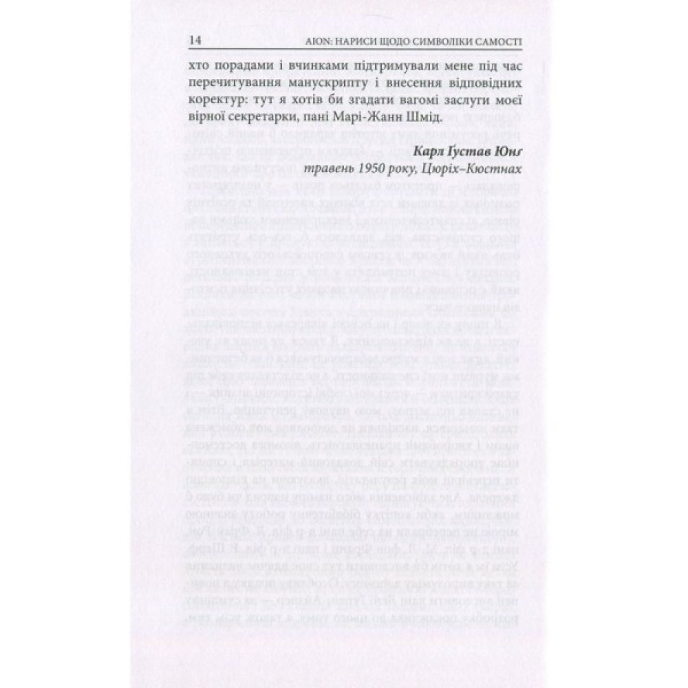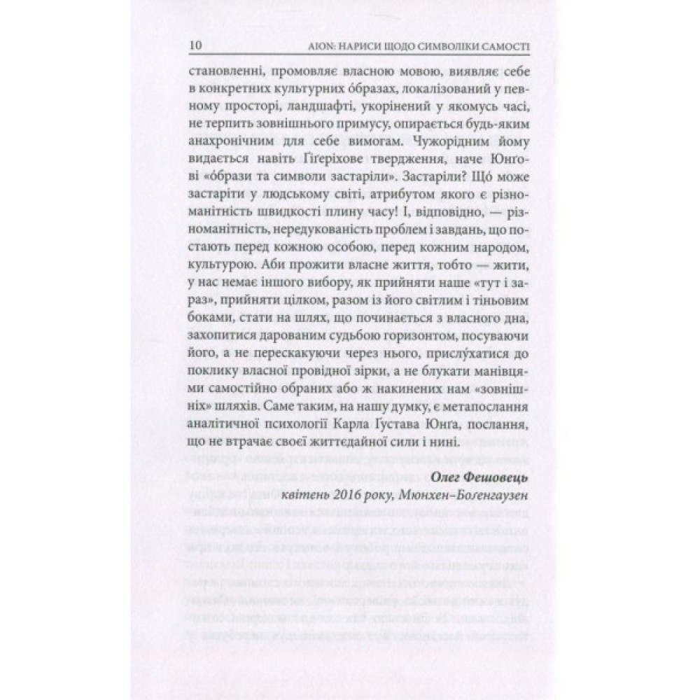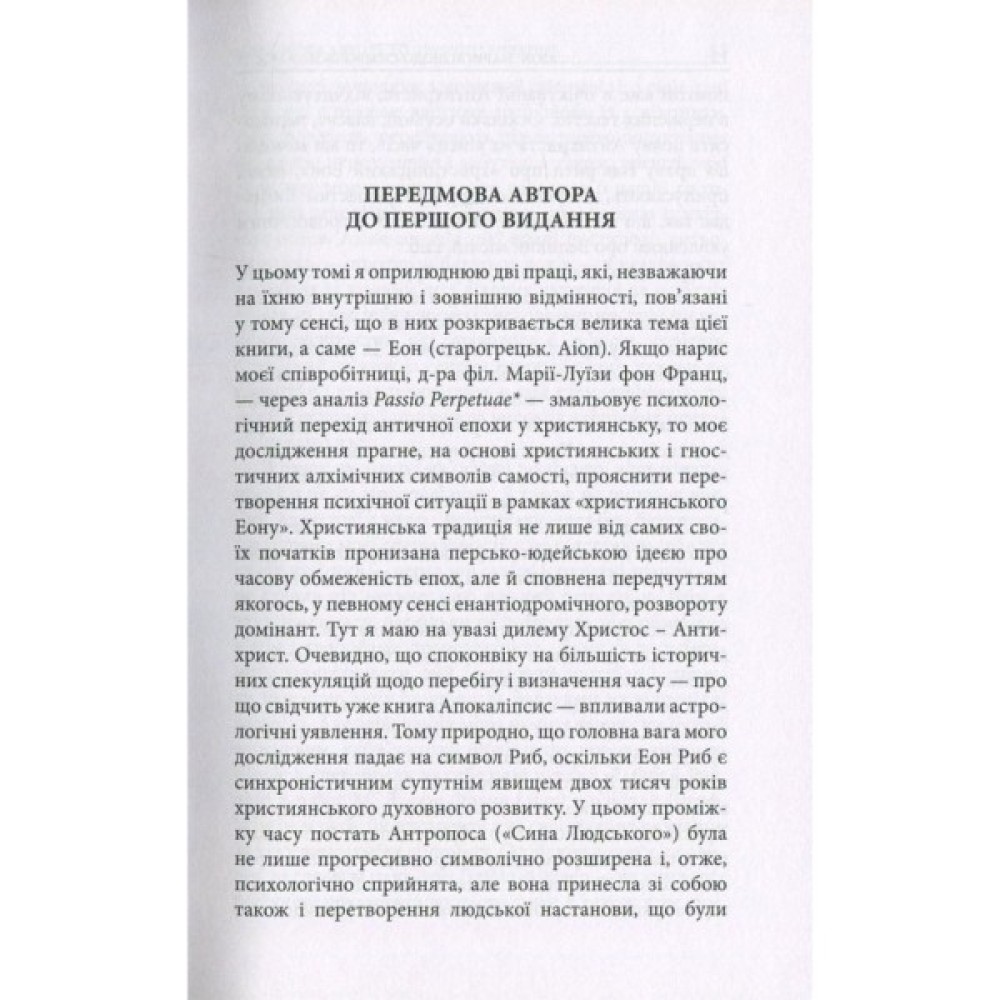 Книга Карла Ґустава Юнґа (1875-1961) «Аion» належить до найважливіших пізніх творінь автора і розвиває проблематику, опрацьовану в його збірці нарисів «Архетипи і колективне несвідоме». Опираючись на широку експлікацію християнської, гностичної та алхімічної символік, автор пояснює архетип психічної цілості, самості, історично пов’язуючи його з постаттю Христа, яка, на його думку, є символом всеохопної цілості під час християнського Еону, синхроністичного Великому місяцеві Риб. Основним мотивом такого пояснення є намагання допомогти модерній людині дати собі раду із властивими їй знекоріненням та світоглядною дезорієнтацією, що постійно загрожують небезпекою утопічних психозів. Книга буде цікавою не лише для психологів та психотерапевтів, але й для філософів, релігієзнавців, антропологів, мистецтвознавців, а також усіх, хто прагне збагнути часто приховані від ока основи нашого існування.