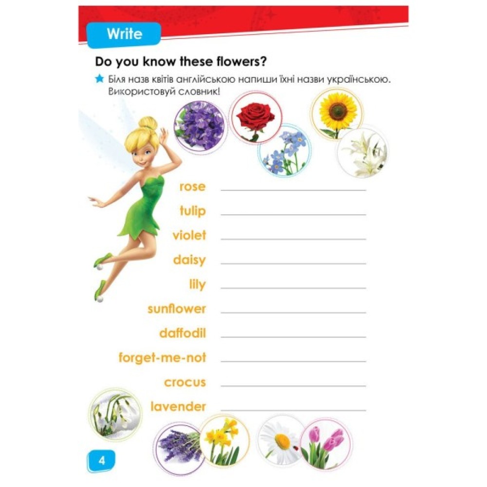 Серія яскравих книжок, героями яких є персонажі популярних мультфільмів Дісней-студії містить цікаві вправи з англійської. Разом з улюбленими персонажами дитина молодшого шкільного віку в ігровій формі легко опанує перші навички спілкування іноземною мовою, поповнить лексичний запас, розів’є пам’ять і увагу.