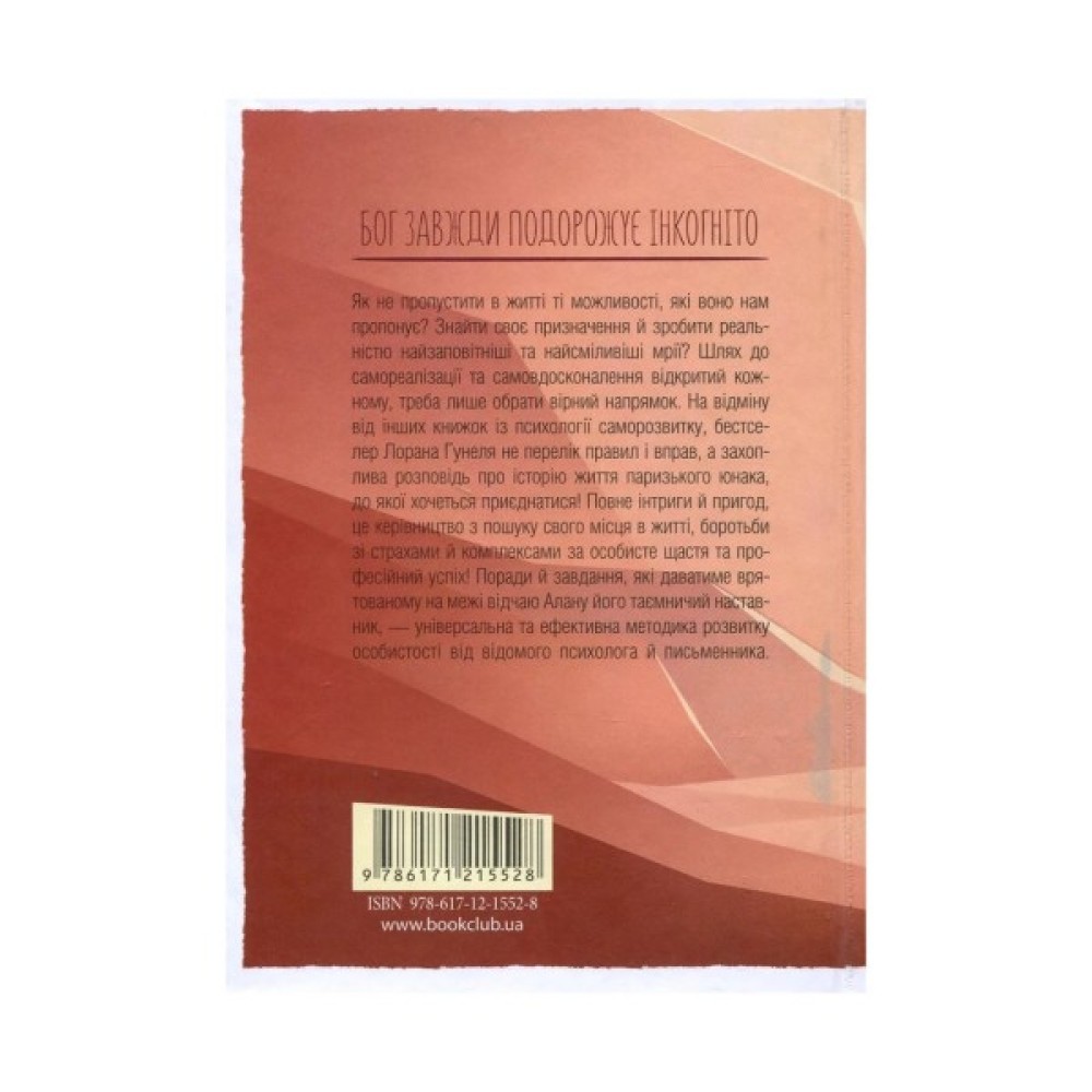 Письменник та психолог Лоран Гунель у книзі «Бог завжди подорожує інкогніто» ділиться своїми порадами про те, як правильно побудувати своє життя та віднайти мотивації. Завдяки досвіду головного героя, ви зможете пройти власний шлях самовдосконалення, знайти своє призначення та втілити у життя найзаповітніші мрії.