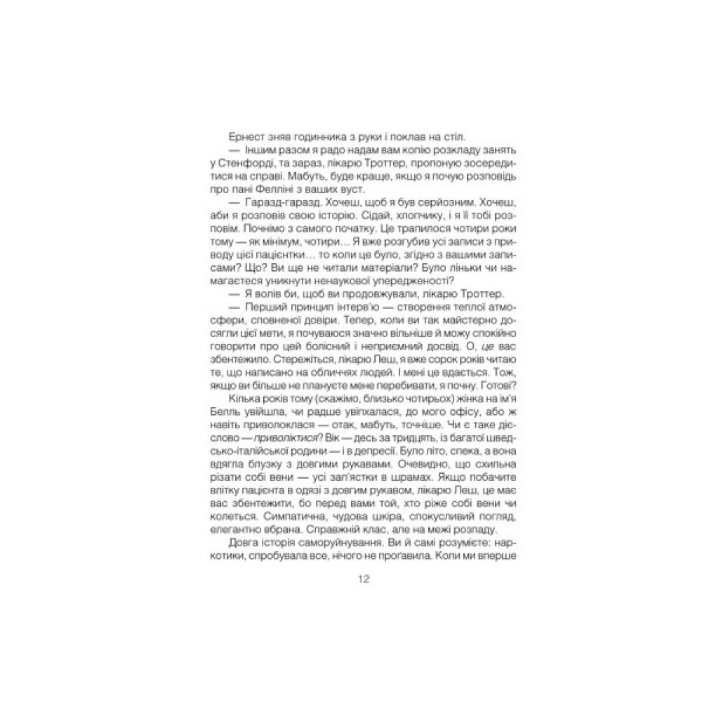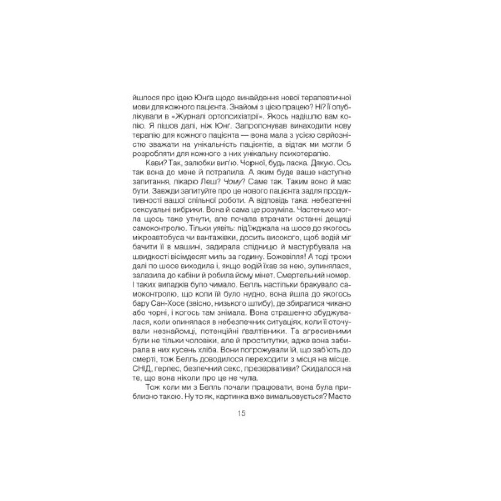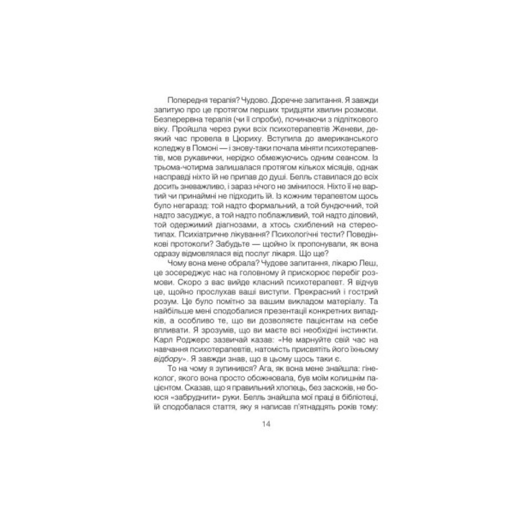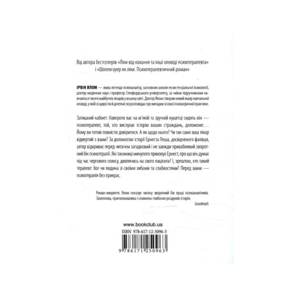 За допомогою історії Ернеста Леша, досвідченого фахівця, автор відкриває перед читачем загадковий і не завжди привабливий зворотний бік психотерапії. Які таємниці минулого приховує Ернест, про що він думає під час чергового сеансу, дивлячись на свого пацієнта? І, зрештою, хто такий терапевт: бог чи людина зі своїми хибами та слабкостями? Перед вами – психотерапія без прикрас.