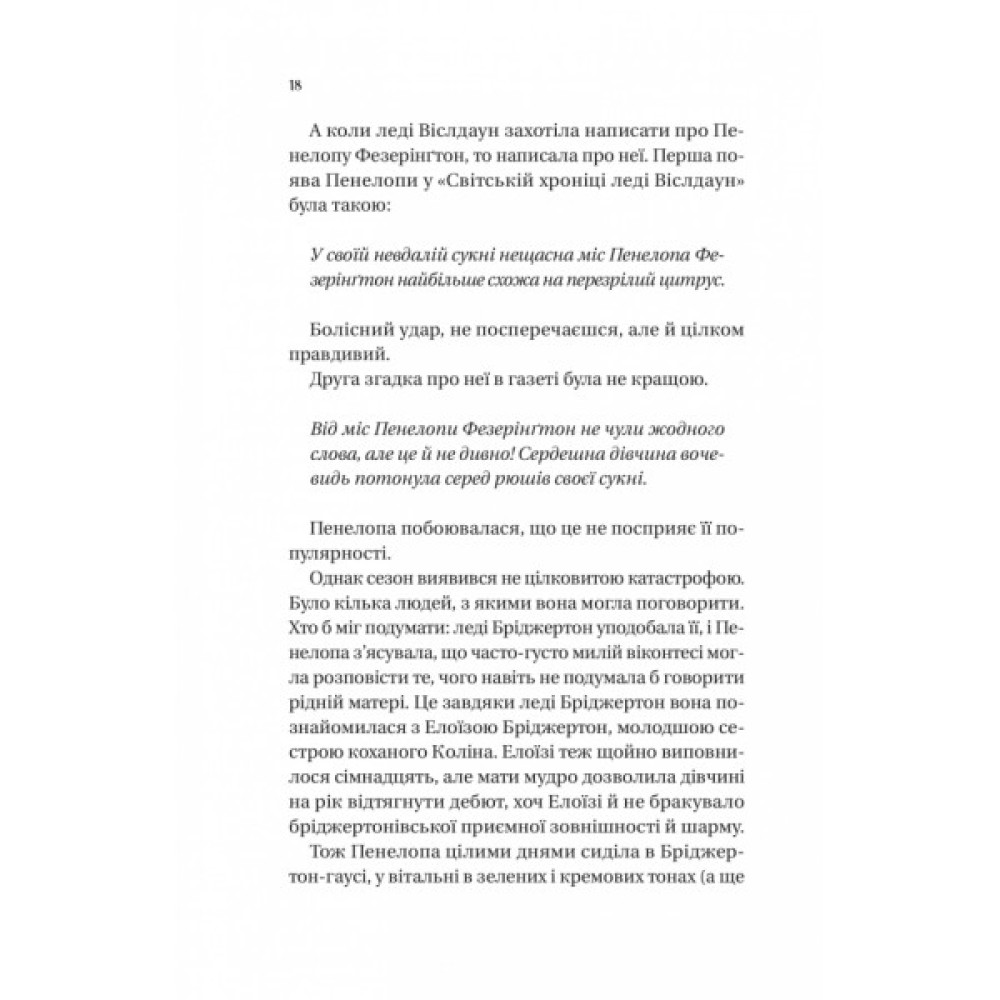Звісно, цього б не хотілося Пенелопі Фезерінґтон, адже вона давно поглинута почуттями до Коліна, які переросли в дещо більше за дружбу. А втім, Пенелопа відвідує сезон не перший і далеко не другий рік підряд, ба вже перебуває на порозі перспективи довічно самотнього життя... І поки вся її вузькоглядна родина силкується перетворити наймолодшу з-поміж Фезерінґтонів, Фелісіті, на об’єкт зацікавлення для видного нареченого Коліна Бріджертона, обличчям до Пенелопи повертається невгамовна леді Денбері. Вона оголошує полювання на легендарну леді Віслдаун!